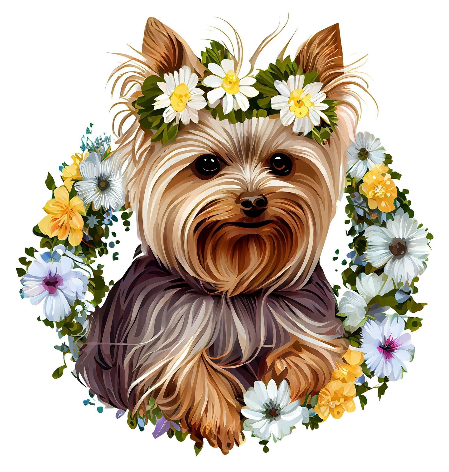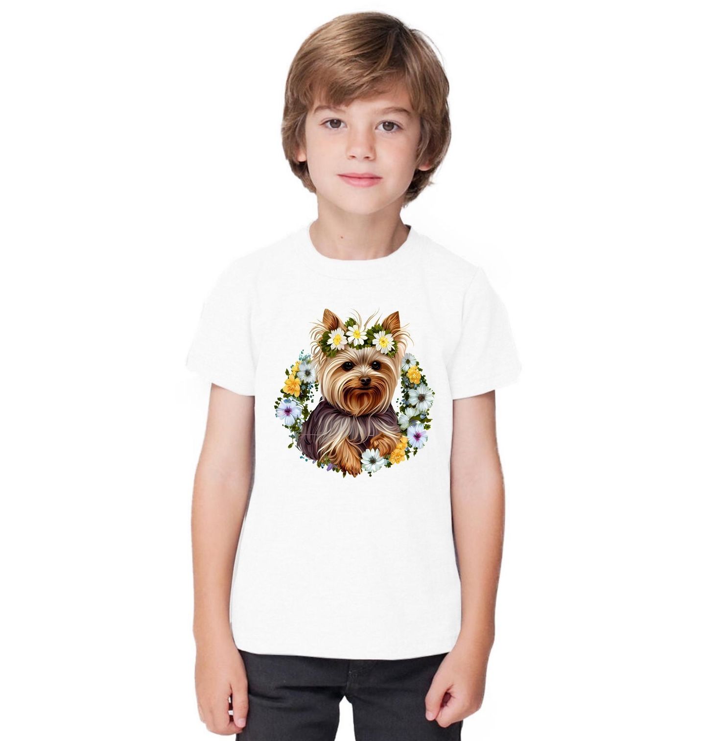 Dětské tričko Jorkšírský teriér v Květinovém Věnci. Roztomilý pes plemene Jorkšírský teriér, obklopený bohatým věncem z jemných květin. Typická dlouhá srst, bystrý pohled a přátelský výraz dělají z tohoto motivu ideální volbu pro každého pejskaře, kdo má k tomuto plemeni blízký vztah.