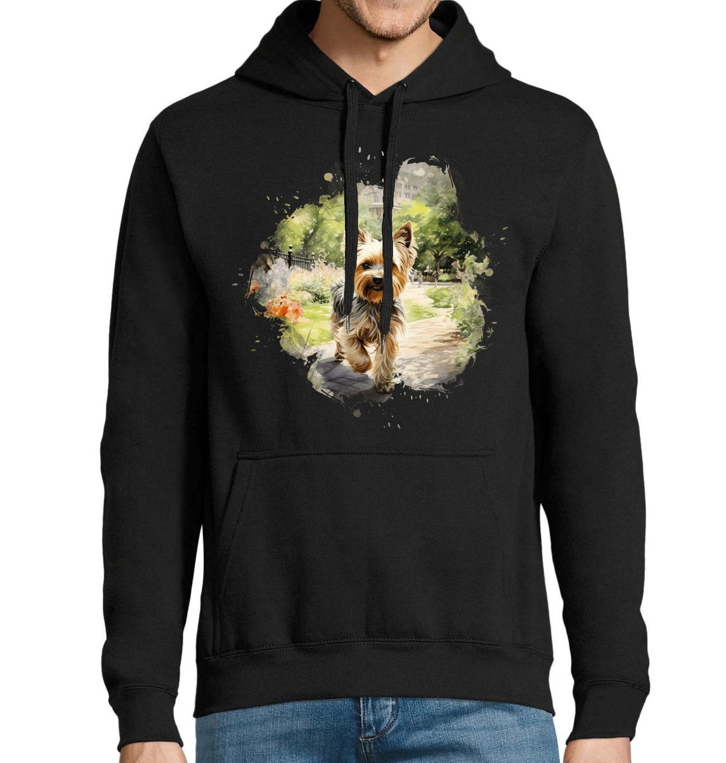 Pánská mikina Jorkšírský teriér ve Městě. Tenhle pes vypadá nenápadně, ale nenech se zmást – jorkšírský teriér je tady jasný boss. Krátké nohy, velké ego a sebevědomí, které by klidně zaplnilo celý les. Přesně ten typ parťáka, se kterým každý pejskař ví, že obyčejná procházka se může změnit v epické dobrodružství.