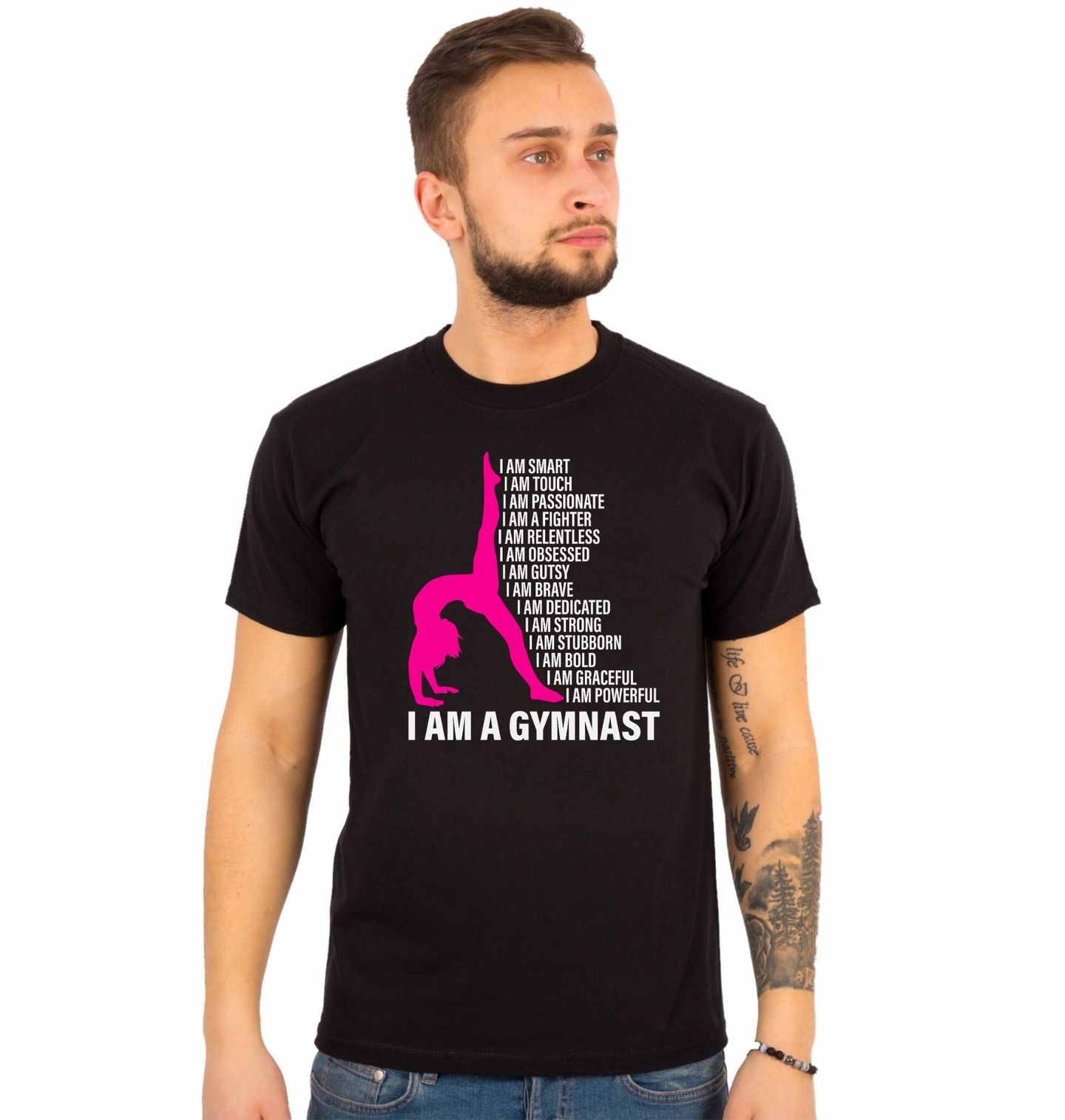 Pánské tričko Jsem Gymnastka I am a Gymnast. Text na motivu zní: „I am smart, I am tough, I am passionate, I am a fighter, I am relentless, I am obsessed, gutsy, brave, dedicated, strong, stubborn, bold, graceful, powerful – I am a gymnast“, což v překladu znamená: „Jsem chytrá, jsem tvrdá, jsem vášnivá, jsem bojovnice, neúnavná, posedlá, odvážná, statečná, oddaná, silná, tvrdohlavá, smělá, elegantní, jsem mocná – jsem gymnastka.“