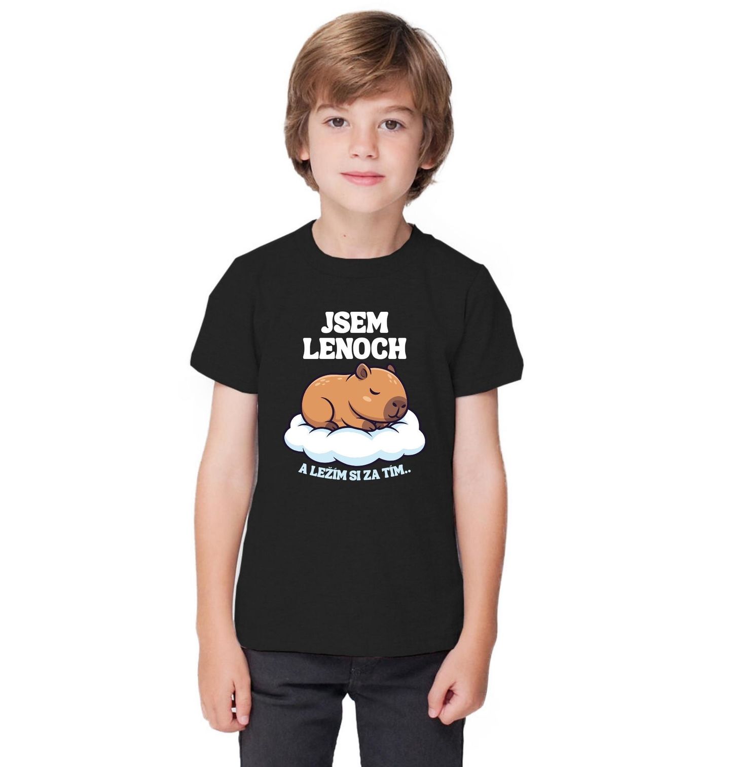 Dětské tričko Jsem lenoch a ležím si za tím..Tahle kapybara má naprosto jasno. Spánek je posvátný, lenost je umění a cloud je nejen v telefonu, ale i pod hlavou. Největší výkon dne může být klidně pořádný odpočinek. Spící hlodavec na obláčku zaujme každého, kdo miluje humor, relax a zvířecí klid.