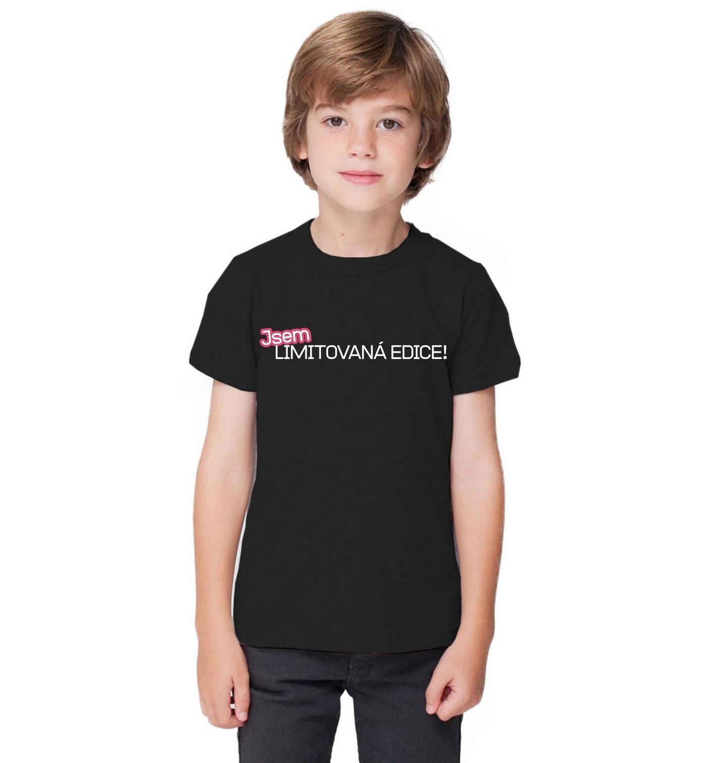 Dětské tričko Jsem limitovaná edice! Růžová edice. Elegantní a sebevědomý motiv s nápisem „Jsem limitovaná edice“ vyniká růžově zvýrazněným slovem „jsem“, které dodává designu jemný ženský nádech. Minimalistická typografie působí stylově a moderně a vystihuje každou ženu, která ví, že její original osobnost je to nejcennější.