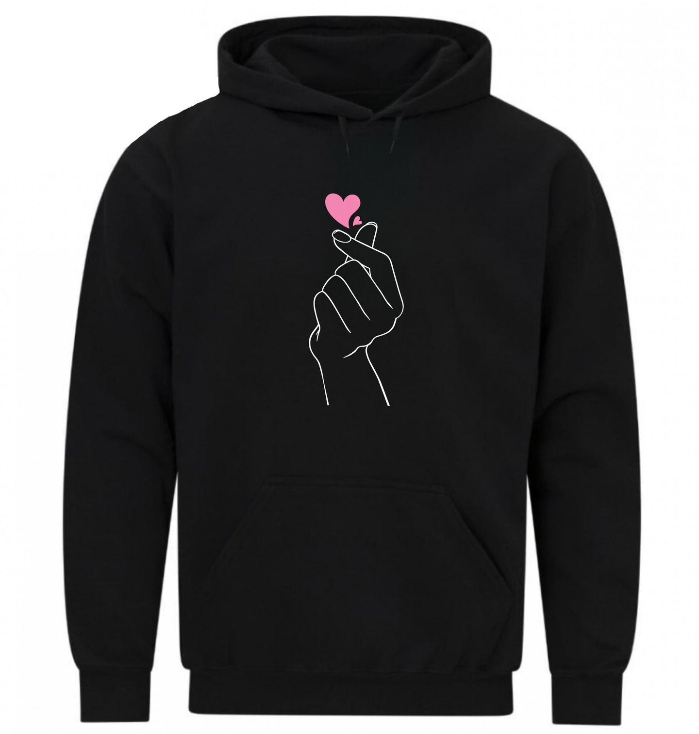 Pánská mikina K-pop Finger heart. Prstové srdce, nazývané také korejské prstové srdce, je gesto popularizované v Jižní Koreji v 90. letech minulého století. Toto gesto zpopularizovali idoly K-popu, kteří toto gesto často používali k vyjádření své lásky a vděčnosti svým fanouškům.