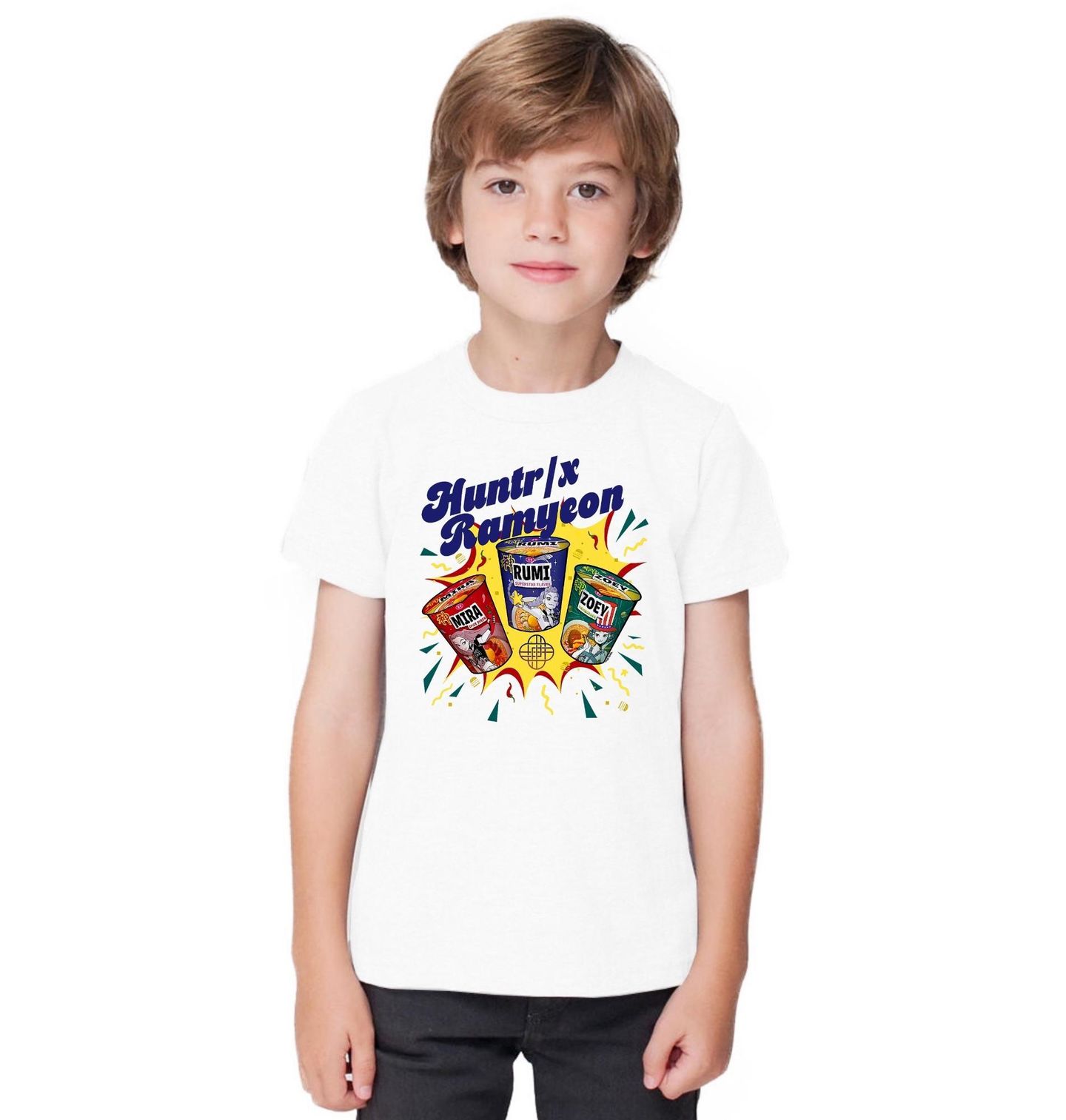 Dětské tričko K-pop Ramen Huntrix Ramyeon. Stylový motiv s ramen nudlemi a členkami fiktivní K-pop skupiny Huntr/x ze světa filmu KPop Demon Hunters. Rumi, Mira a Zoey přichází v edici instantních kelímků s příchutí superstar, spice queen a hamburger – připraveni zachránit svět (nebo alespoň tvoji večeři).