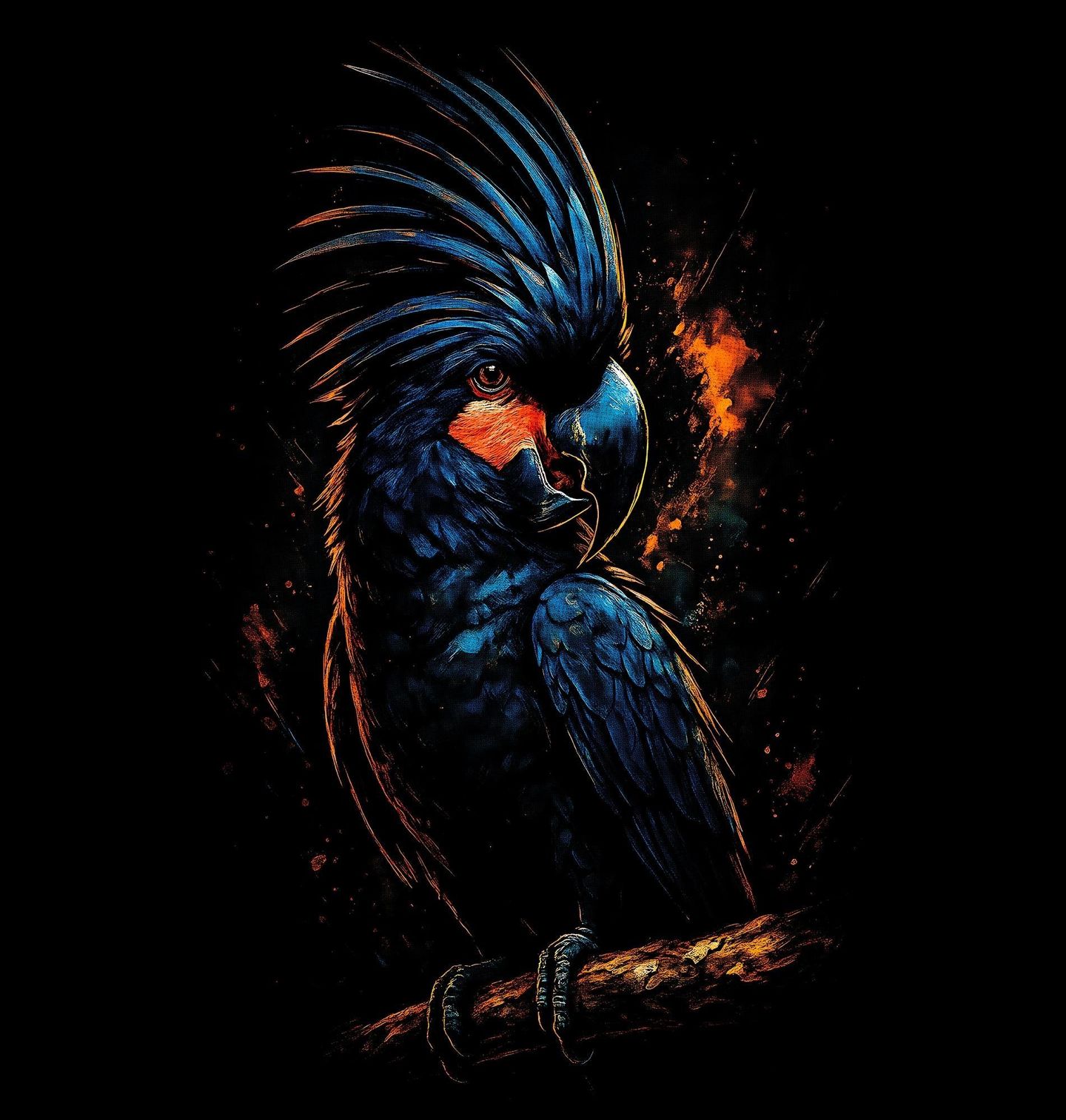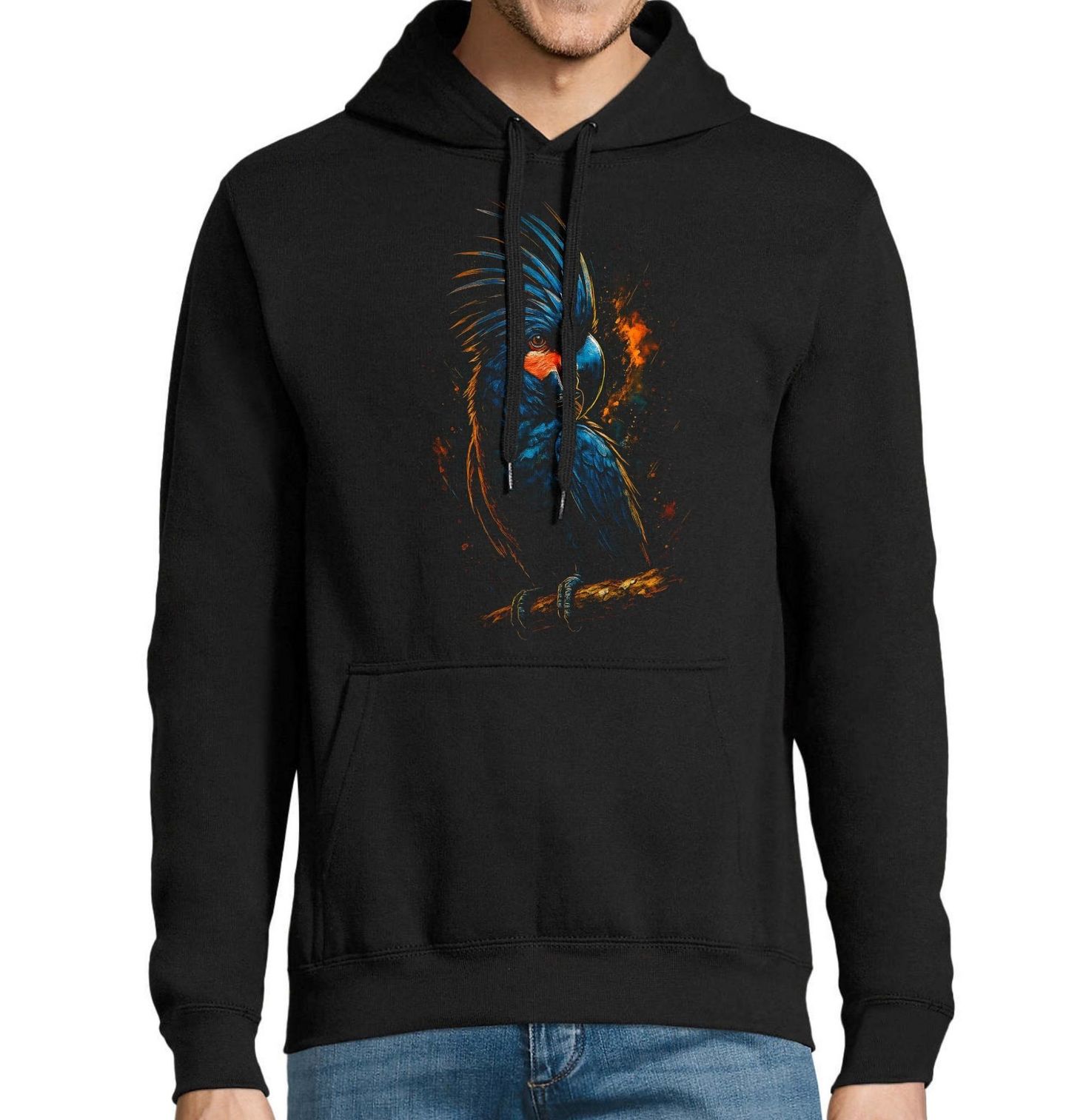 Pánská mikina Kakadu palmový. Na ilustraci je papoušek kakadu palmový, výjimečný tropický pták známý svým temným peřím, výraznou vztyčenou chocholkou a červeným lícním pruhem. Tento papoušek působí tajemně, silně a zároveň elegantně – je symbolem individuality a vnitřní síly.