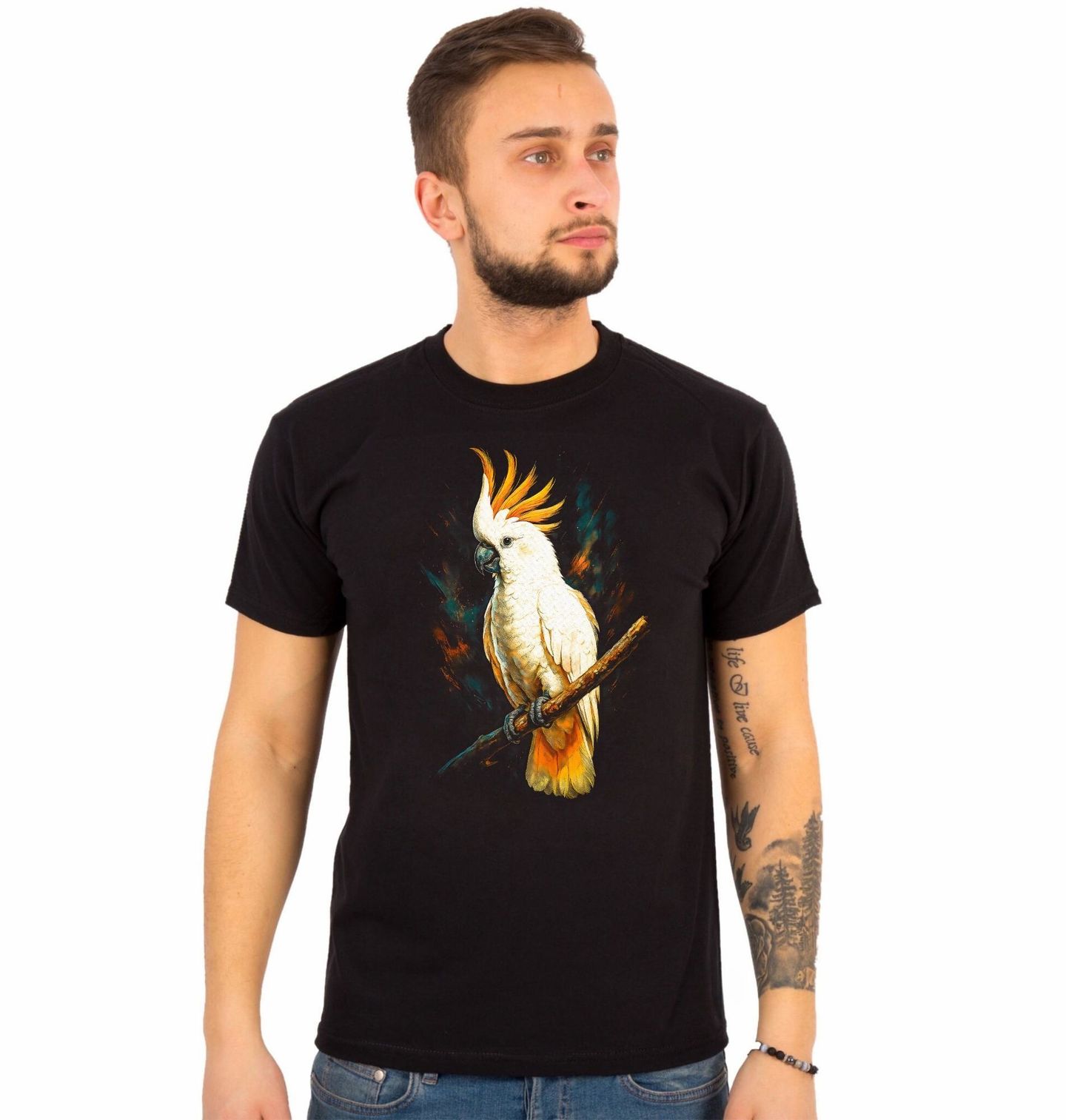 Pánské tričko Kakadu žlutočečelatý. Papoušek kakadu žlutočečelatý (Cacatua galerita). Typické znaky: bílý papoušek, výrazná žlutá chocholka, silný tmavý zobák. Tento inteligentní pták je známý svou výraznou žlutou chocholkou, sněhově bílým peřím a silnou osobností. Kakadu žlutočečelatý pochází především z Austrálie a patří mezi nejspolečenštější druhy papoušků.