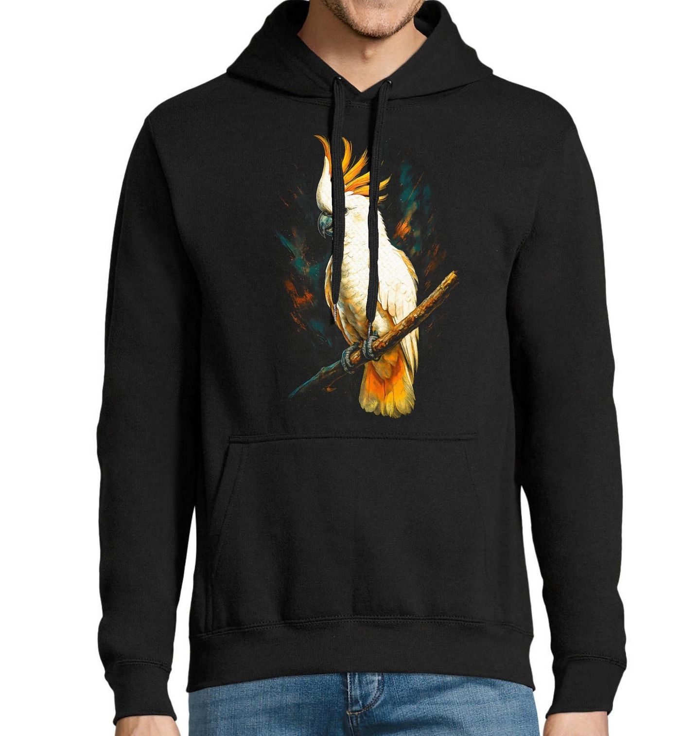 Pánská mikina Kakadu žlutočečelatý. Papoušek kakadu žlutočečelatý (Cacatua galerita). Typické znaky: bílý papoušek, výrazná žlutá chocholka, silný tmavý zobák. Tento inteligentní pták je známý svou výraznou žlutou chocholkou, sněhově bílým peřím a silnou osobností. Kakadu žlutočečelatý pochází především z Austrálie a patří mezi nejspolečenštější druhy papoušků.