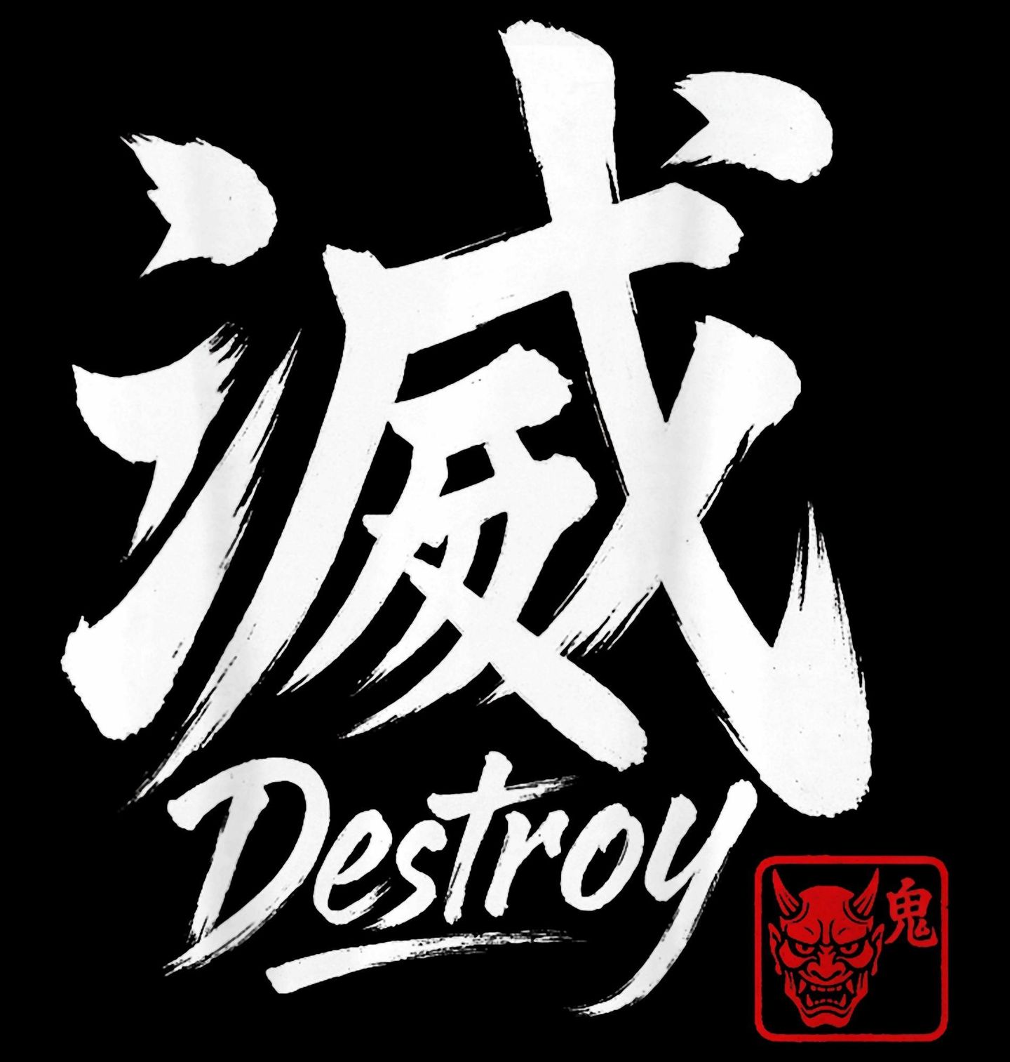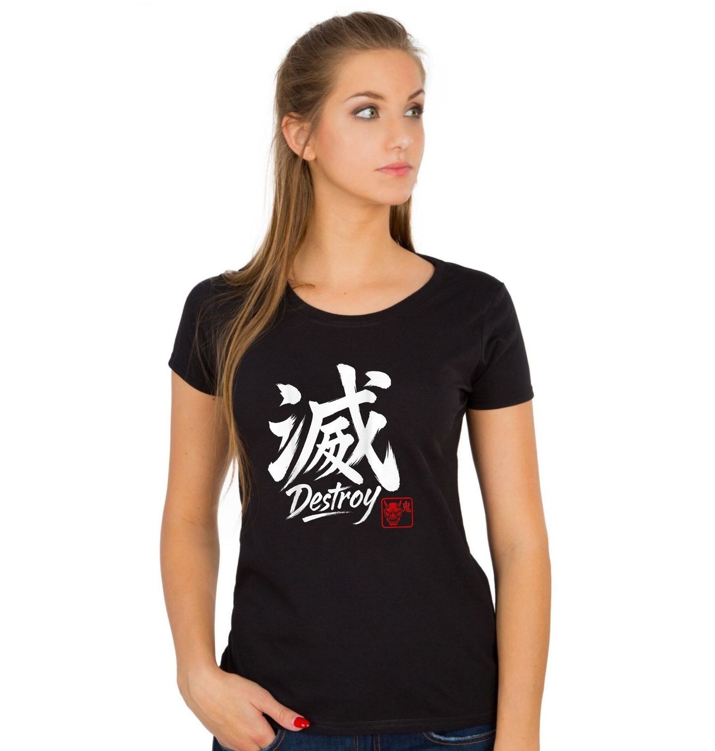 Dámské tričko Kaligrafie Destroy s démonem Oni. Uprostřed designu je velký japonský znak v kaligrafickém stylu, pod ním anglické slovo „Destroy“ a v rohu červené razítko s maskou démonického Oni. Silný kontrast bílé a černé dodává motivu energii, rebelský výraz a sílu. Velký japonský znak: 滅 (metsu) znamená: vyhladit. Ideální pro každého, kdo miluje Japonsko.