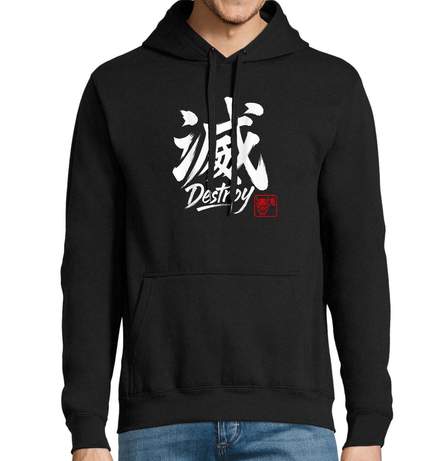 Pánská mikina Kaligrafie Destroy s démonem Oni. Uprostřed designu je velký japonský znak v kaligrafickém stylu, pod ním anglické slovo „Destroy“ a v rohu červené razítko s maskou démonického Oni. Silný kontrast bílé a černé dodává motivu energii, rebelský výraz a sílu. Velký japonský znak: 滅 (metsu) znamená: vyhladit. Ideální pro každého, kdo miluje Japonsko.