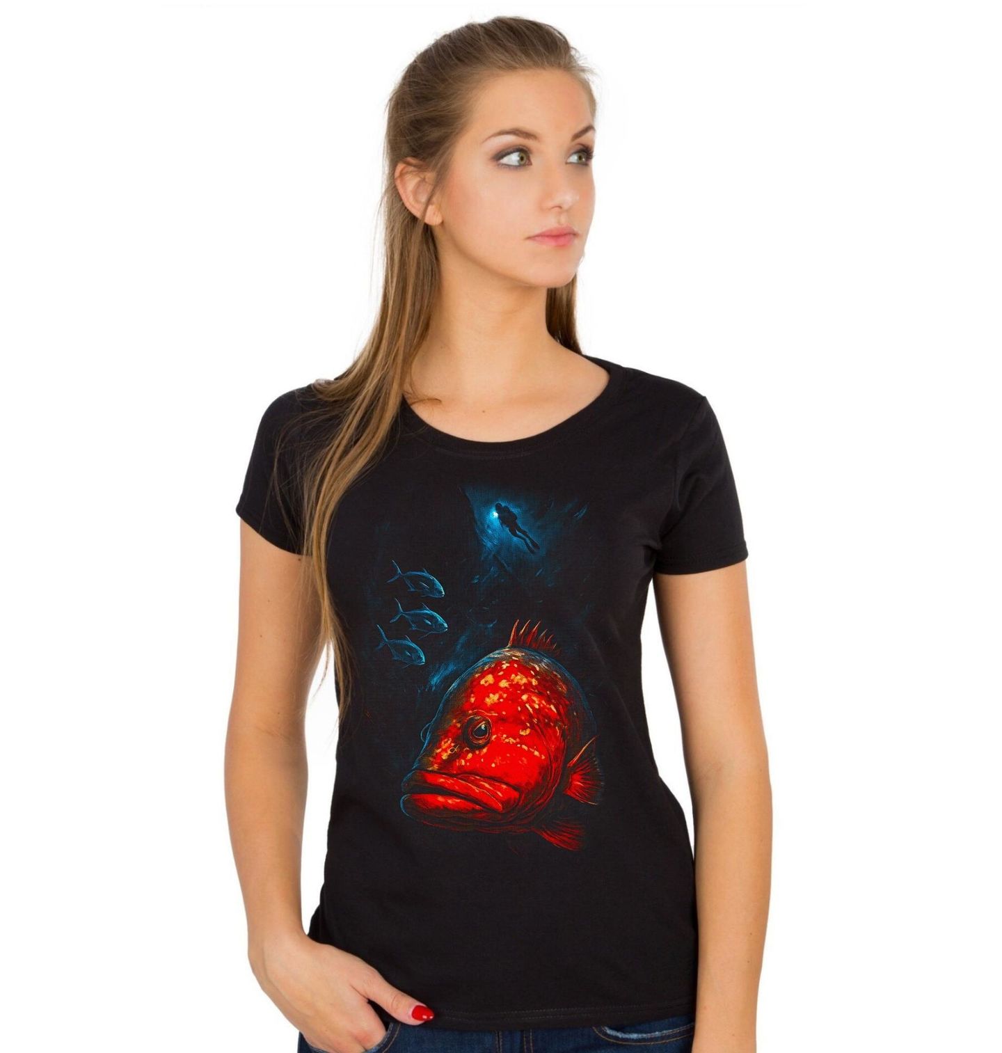 Dámské tričko Kanic obrovský a Potápěč. Zobrazeným druhem je kanicovití, skupina mohutných mořských predátorů obývajících skalnaté dno a korálové útesy. Kanice jsou známé svou teritoriálností, silou a klidným, ale autoritativním chováním. Právě proto jsou symbolem hlubin, které respektuje každý zkušený potápeč, ale i rybář, který zná pravidla moře.