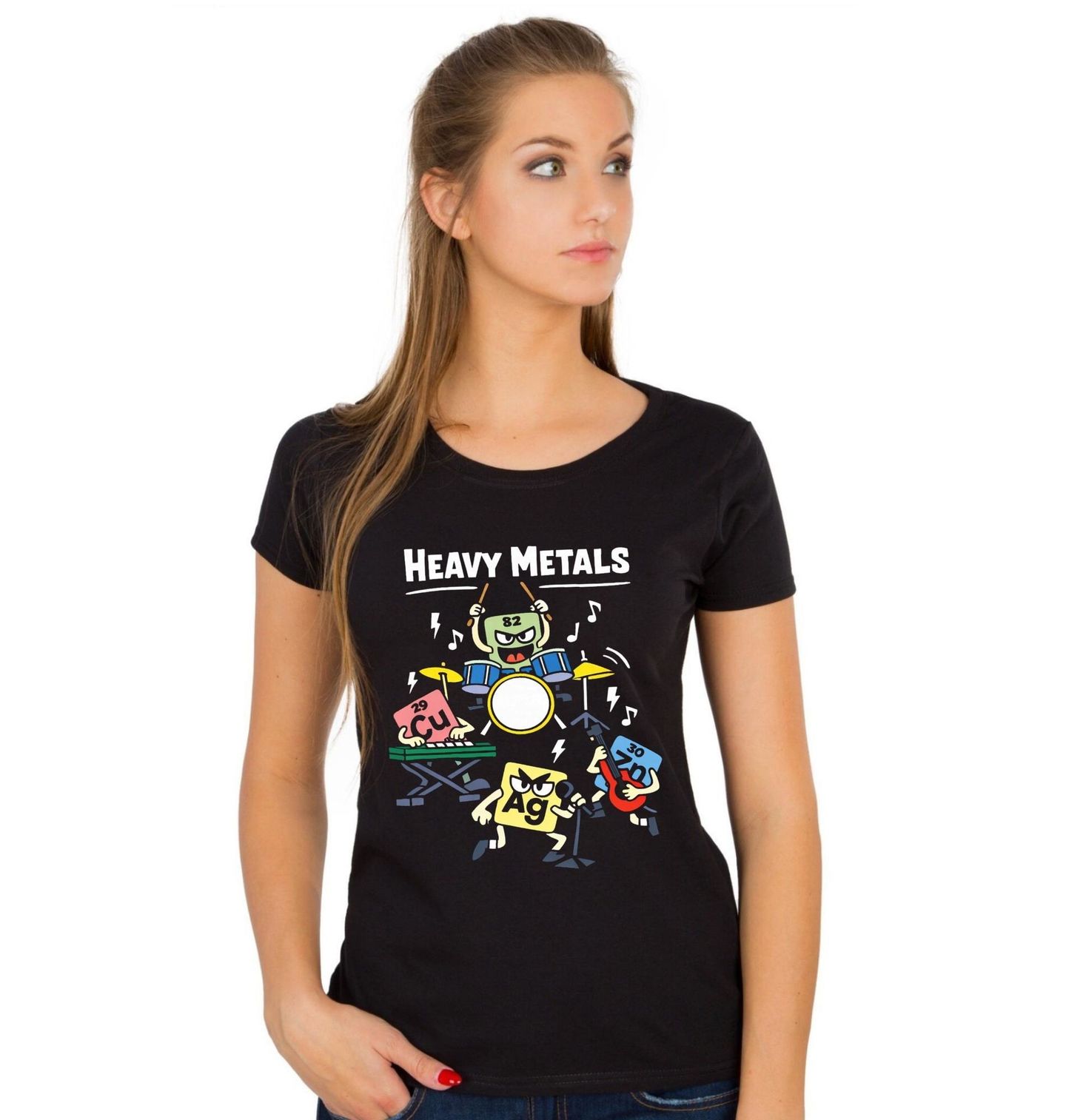 Dámské tričko Kapela Těžkých Kovů. Zábavný a kreativní design spojující chemii a hudbu. Prvky periodické tabulky (Cu, Zn, Ag) hrají v kapele s nápisem „HEAVY METALS“ (Těžké kovy). Ideální design pro milovníky vědy, hudby a humoru, kteří ocení originální spojení dvou světů.