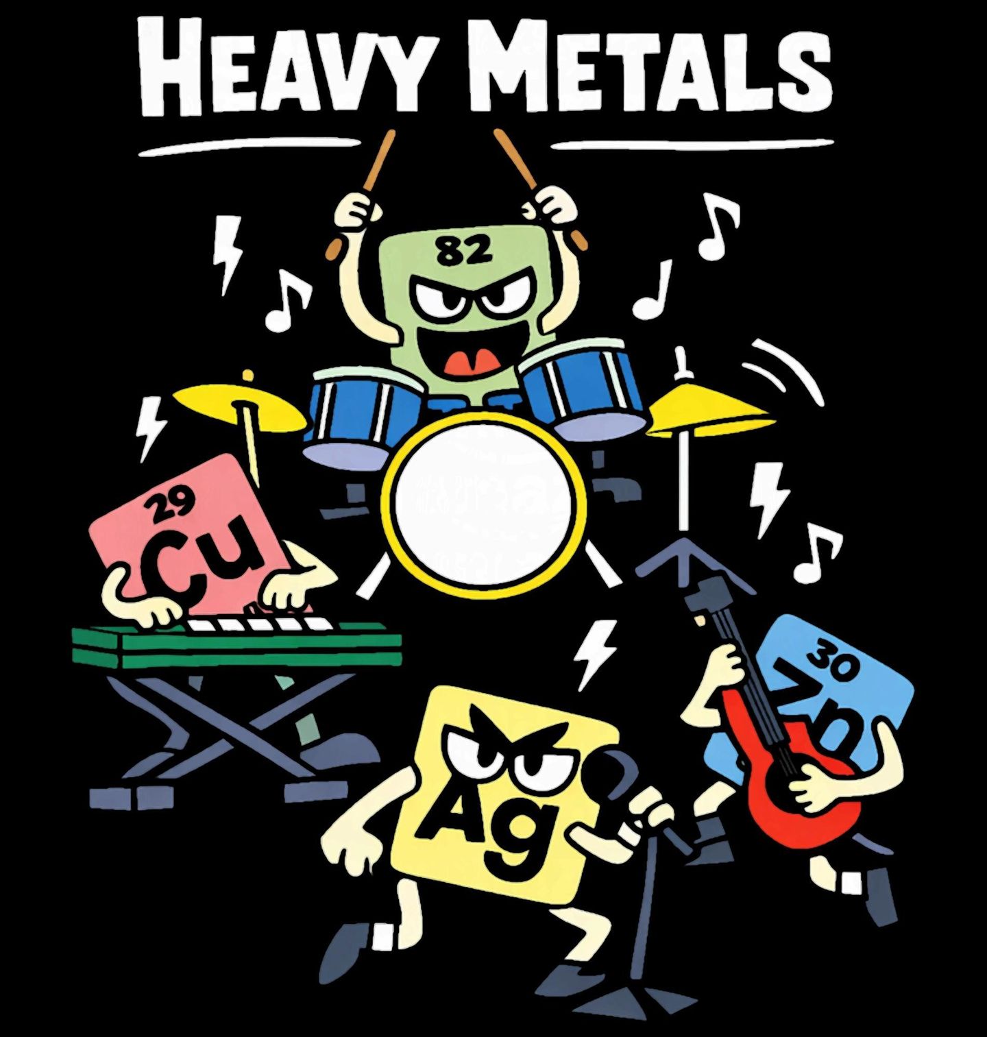 Dětské tričko Kapela Těžkých Kovů. Zábavný a kreativní design spojující chemii a hudbu. Prvky periodické tabulky (Cu, Zn, Ag) hrají v kapele s nápisem „HEAVY METALS“ (Těžké kovy). Ideální design pro milovníky vědy, hudby a humoru, kteří ocení originální spojení dvou světů.