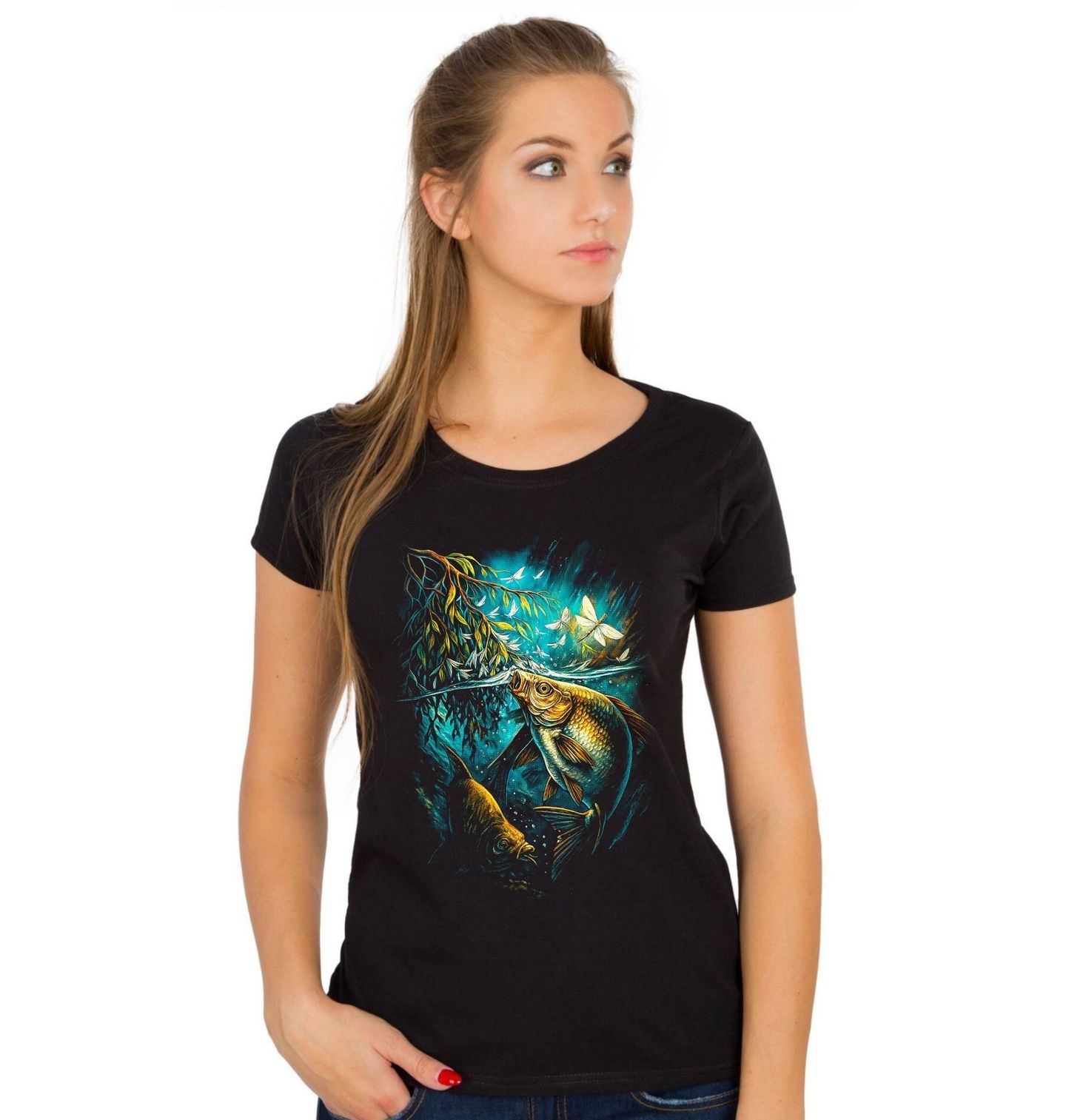 Dámské tričko Kapr na Hladině. Tento výrazný motiv zachycuje kapra obecného (Cyprinus carpio) v jeho přirozeném prostředí těsně pod hladinou, kde sbírá hmyz a reaguje na každý pohyb nad vodou. Okamžik plný klidu, soustředění a napětí, který dokonale vystihuje atmosféru rybaření, jakou rybář při vodě vyhledává.