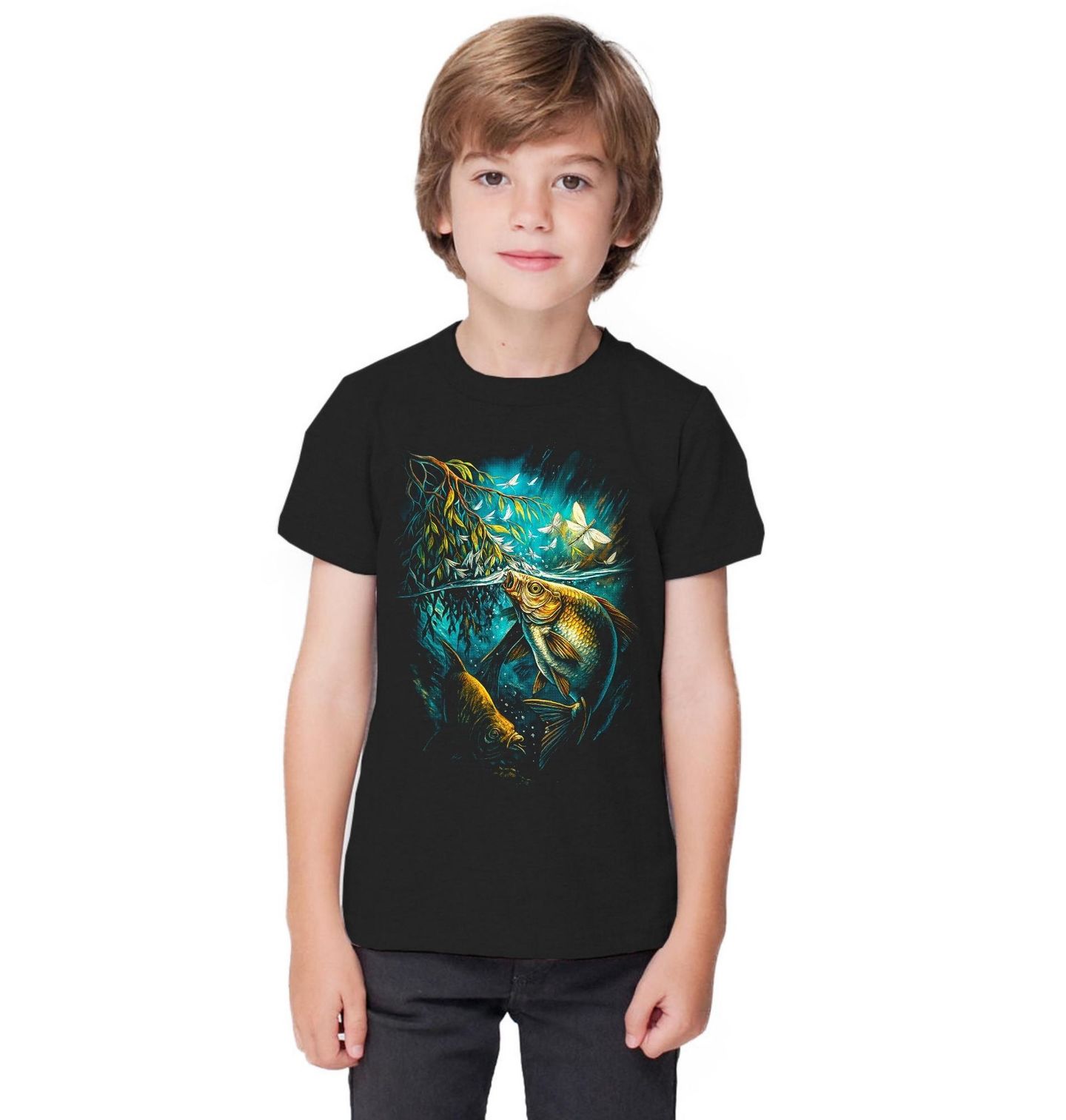 Dětské tričko Kapr na Hladině. Tento výrazný motiv zachycuje kapra obecného (Cyprinus carpio) v jeho přirozeném prostředí těsně pod hladinou, kde sbírá hmyz a reaguje na každý pohyb nad vodou. Okamžik plný klidu, soustředění a napětí, který dokonale vystihuje atmosféru rybaření, jakou rybář při vodě vyhledává.