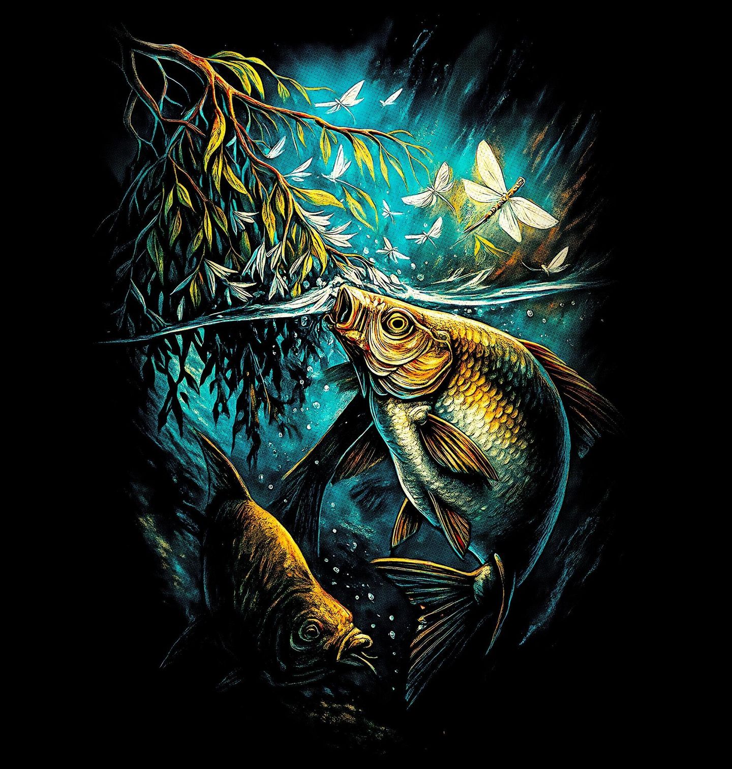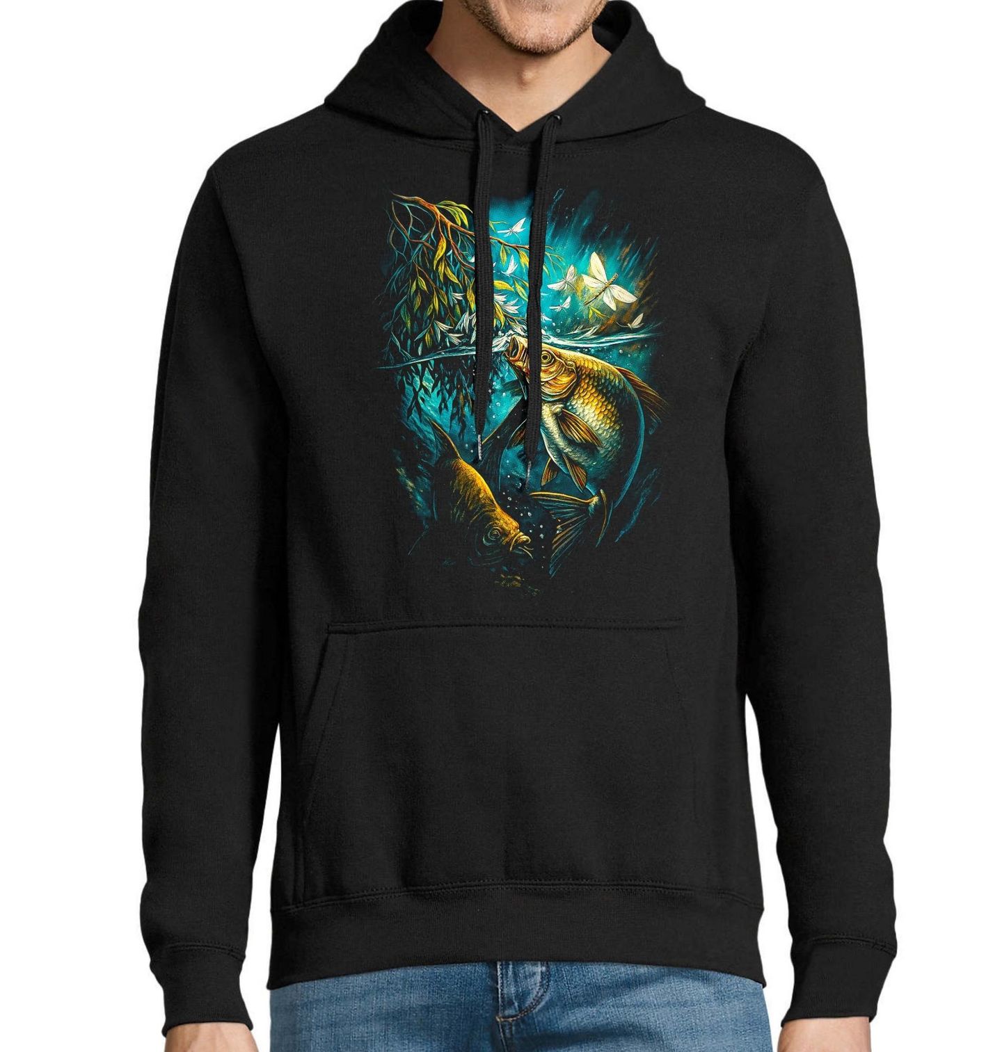 Pánská mikina Kapr na Hladině. Tento výrazný motiv zachycuje kapra obecného (Cyprinus carpio) v jeho přirozeném prostředí těsně pod hladinou, kde sbírá hmyz a reaguje na každý pohyb nad vodou. Okamžik plný klidu, soustředění a napětí, který dokonale vystihuje atmosféru rybaření, jakou rybář při vodě vyhledává.