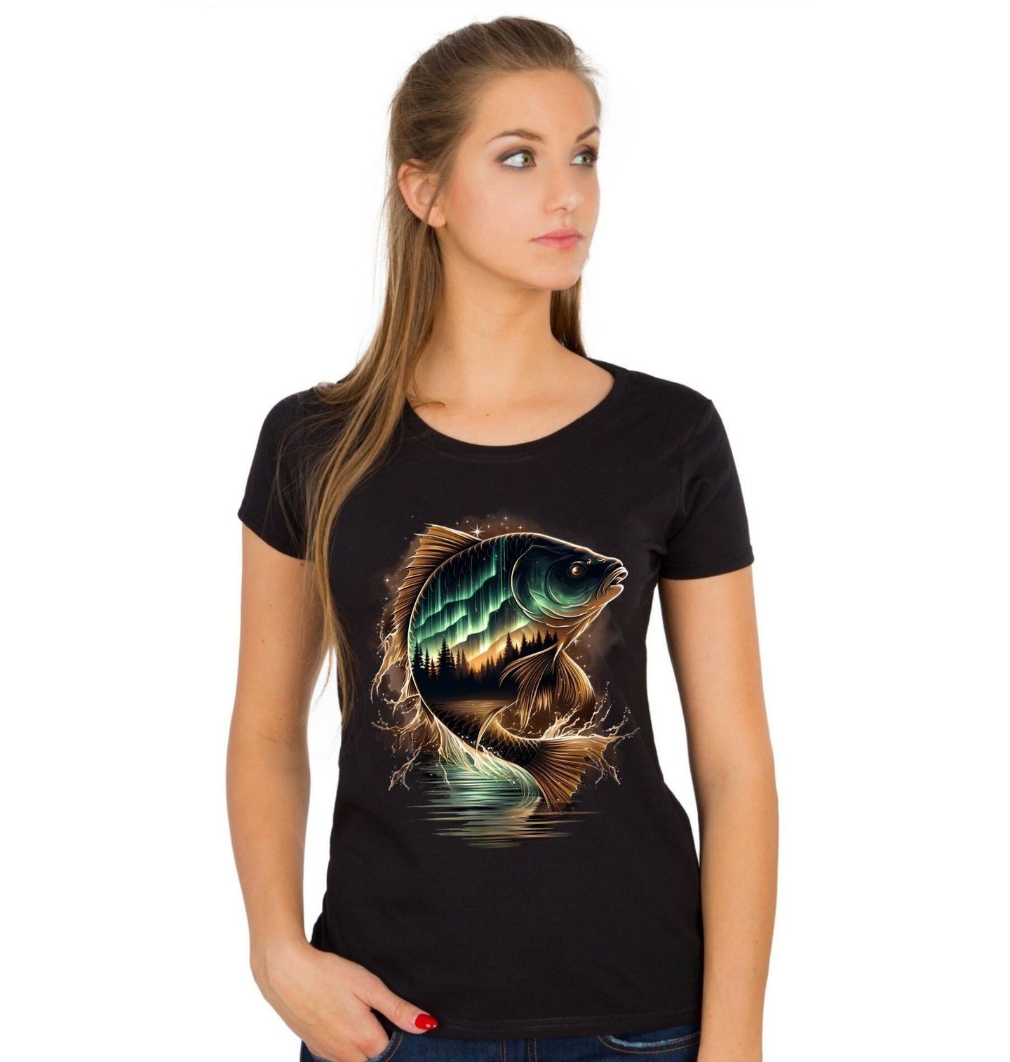 Dámské tričko Kapr v Polární Záři. Unikátní motiv zachycuje majestátního kapra v magickém provedení s noční krajinou polární záře v jeho siluetě. Tento design spojuje vášeň pro rybaření s krásou přírody a silou vody. Detailní ilustrace působí dynamicky, moderně a zároveň respektuje symboliku, kterou kapr pro každého rybář představuje – trpělivost, vytrvalost a respekt k přírodě.