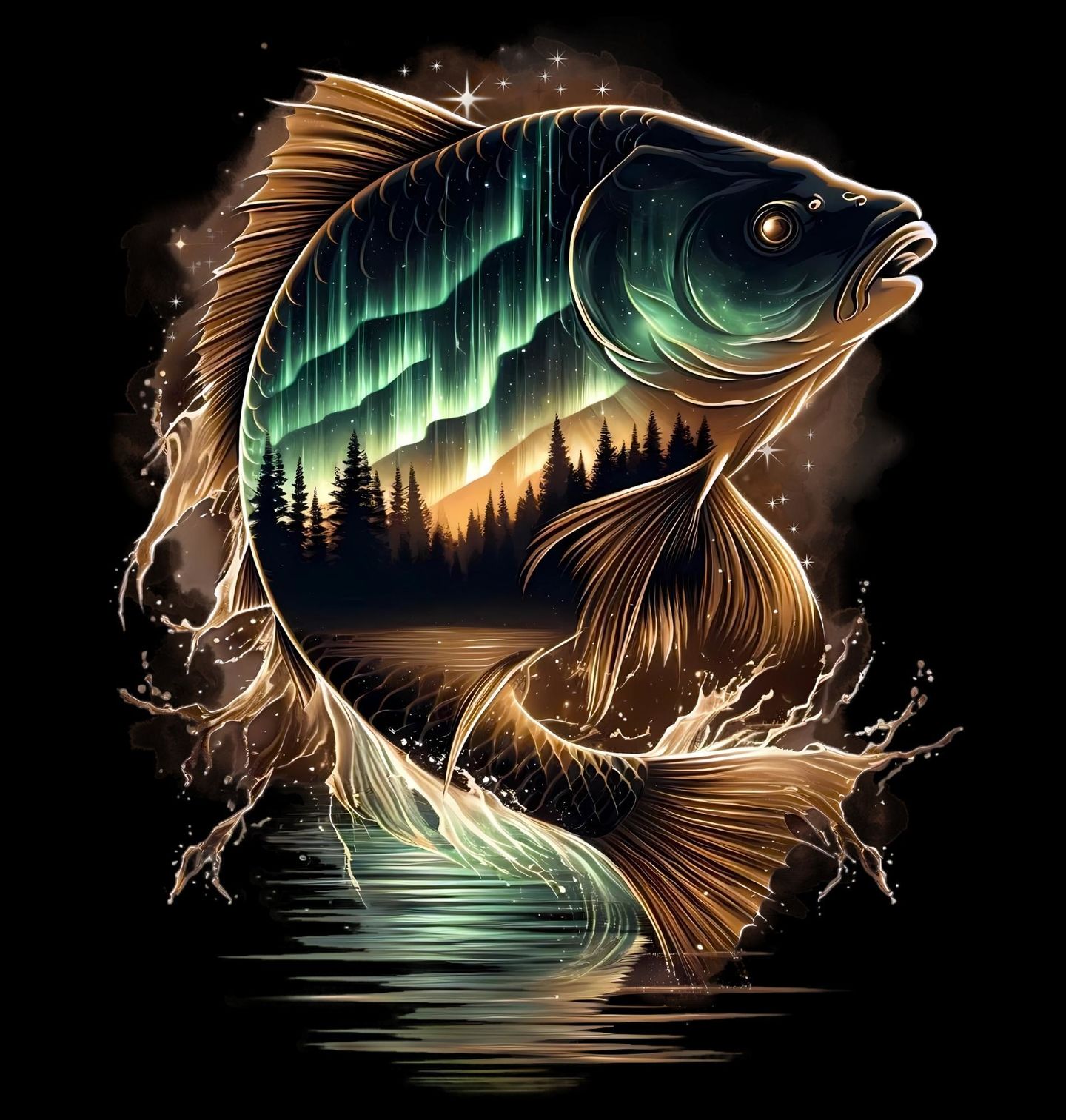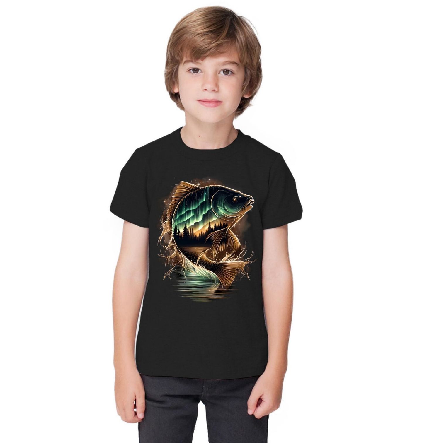 Dětské tričko Kapr v Polární Záři. Unikátní motiv zachycuje majestátního kapra v magickém provedení s noční krajinou polární záře v jeho siluetě. Tento design spojuje vášeň pro rybaření s krásou přírody a silou vody. Detailní ilustrace působí dynamicky, moderně a zároveň respektuje symboliku, kterou kapr pro každého rybář představuje – trpělivost, vytrvalost a respekt k přírodě.