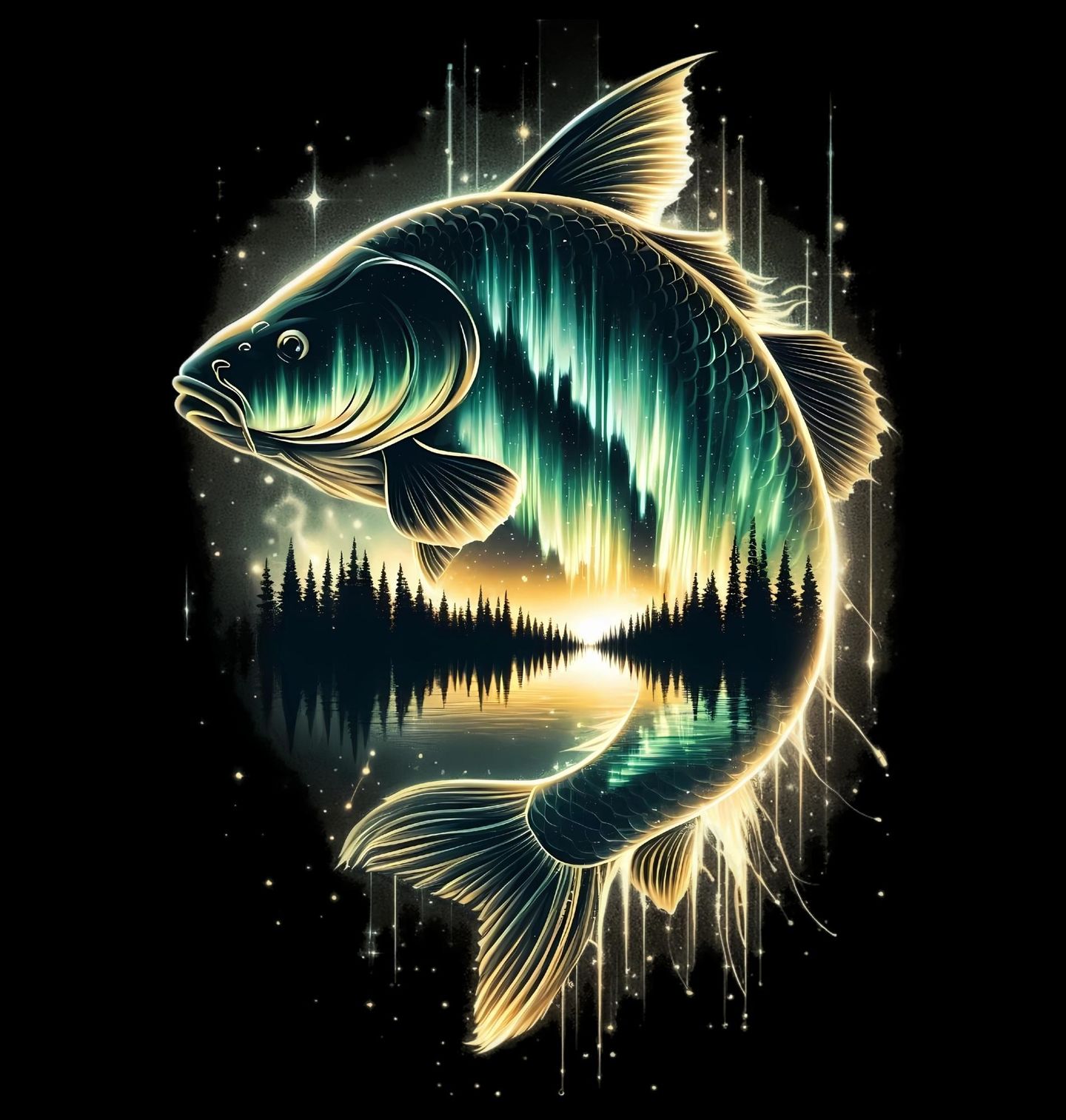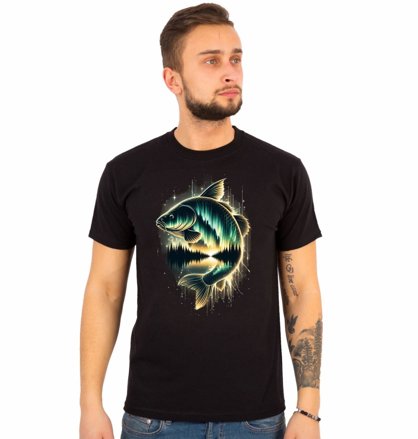 Pánské tričko Kapr ve Světle Polární Záře. Tento jedinečný motiv zachycuje majestátního kapra v okamžiku, kdy se jeho silueta prolíná s noční krajinou a zářící polární záře osvětluje les i klidnou hladinu jezera. Design spojuje vášeň pro rybaření s mystickou atmosférou severské noci. Pro každý rybář představuje kapr víc než jen úlovek – je symbolem trpělivosti, síly a respektu k přírodě.