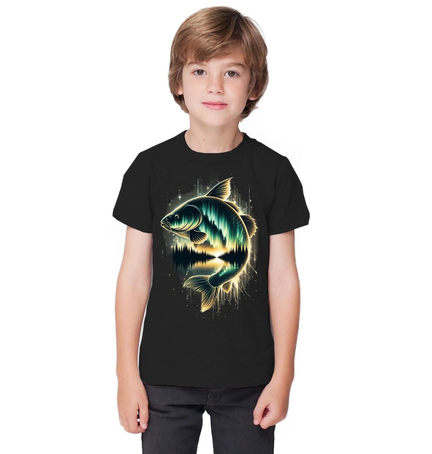 Dětské tričko Kapr ve Světle Polární Záře. Tento jedinečný motiv zachycuje majestátního kapra v okamžiku, kdy se jeho silueta prolíná s noční krajinou a zářící polární záře osvětluje les i klidnou hladinu jezera. Design spojuje vášeň pro rybaření s mystickou atmosférou severské noci. Pro každý rybář představuje kapr víc než jen úlovek – je symbolem trpělivosti, síly a respektu k přírodě.