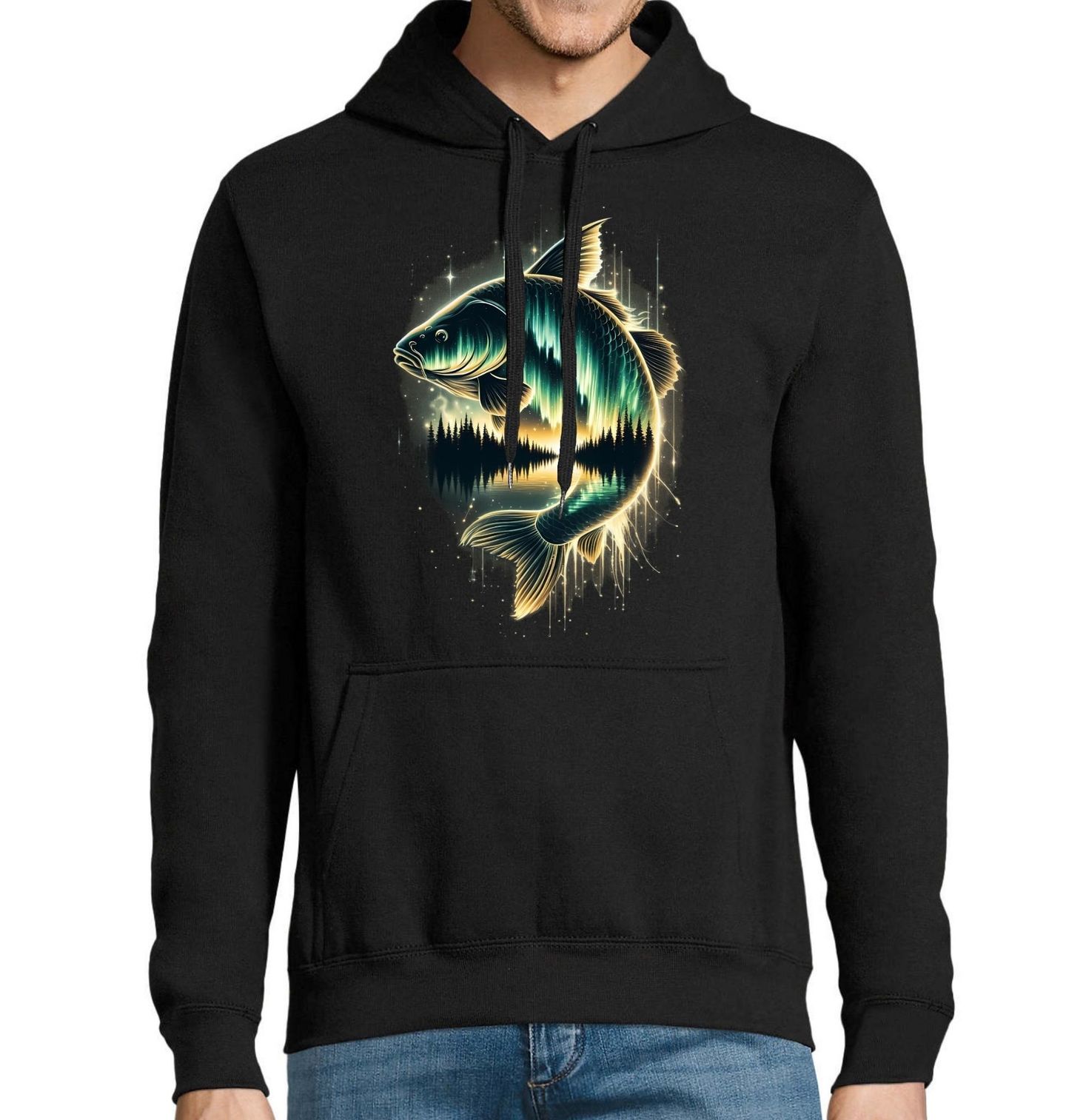 Pánská mikina Kapr ve Světle Polární Záře. Tento jedinečný motiv zachycuje majestátního kapra v okamžiku, kdy se jeho silueta prolíná s noční krajinou a zářící polární záře osvětluje les i klidnou hladinu jezera. Design spojuje vášeň pro rybaření s mystickou atmosférou severské noci. Pro každý rybář představuje kapr víc než jen úlovek – je symbolem trpělivosti, síly a respektu k přírodě.