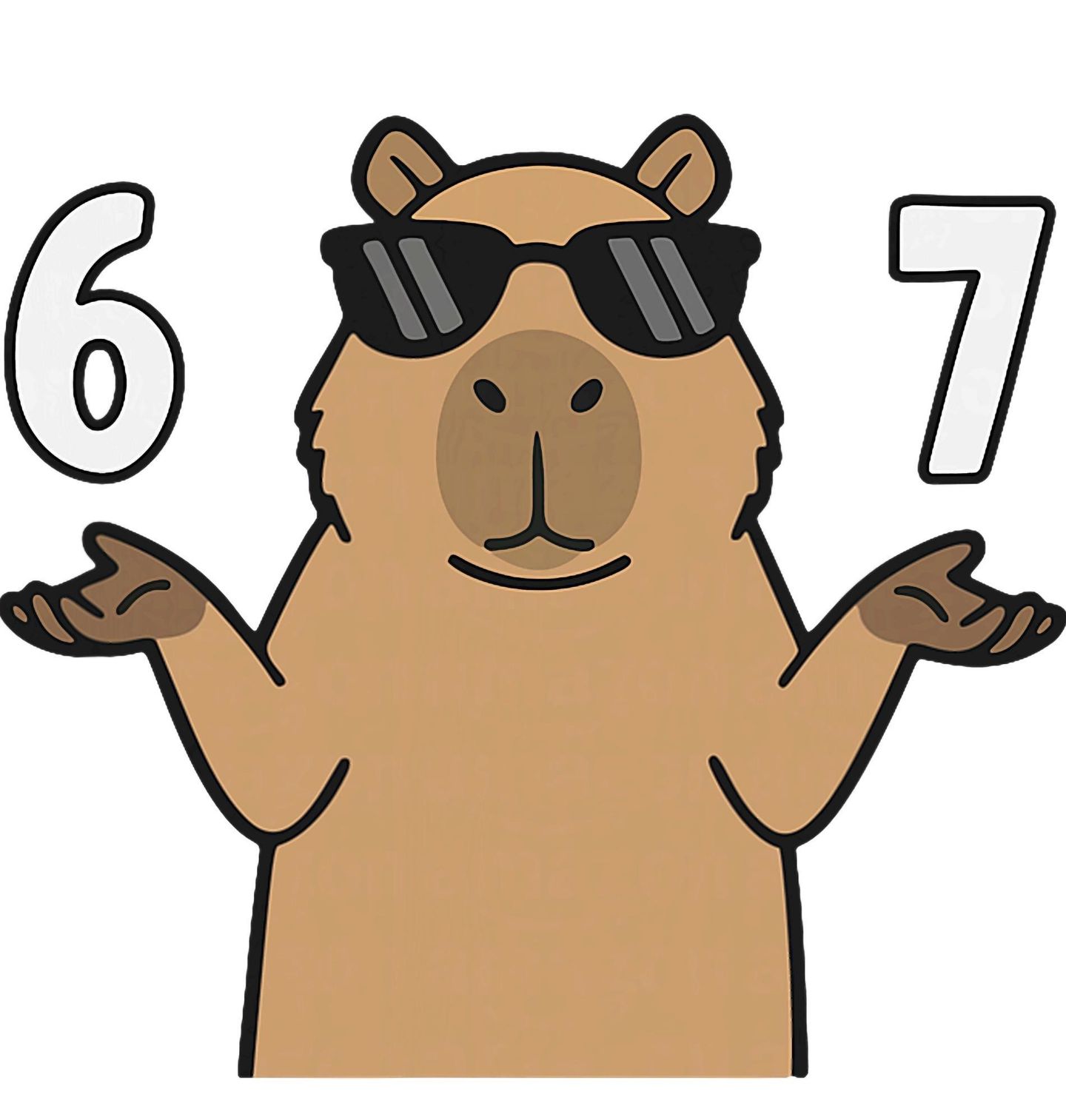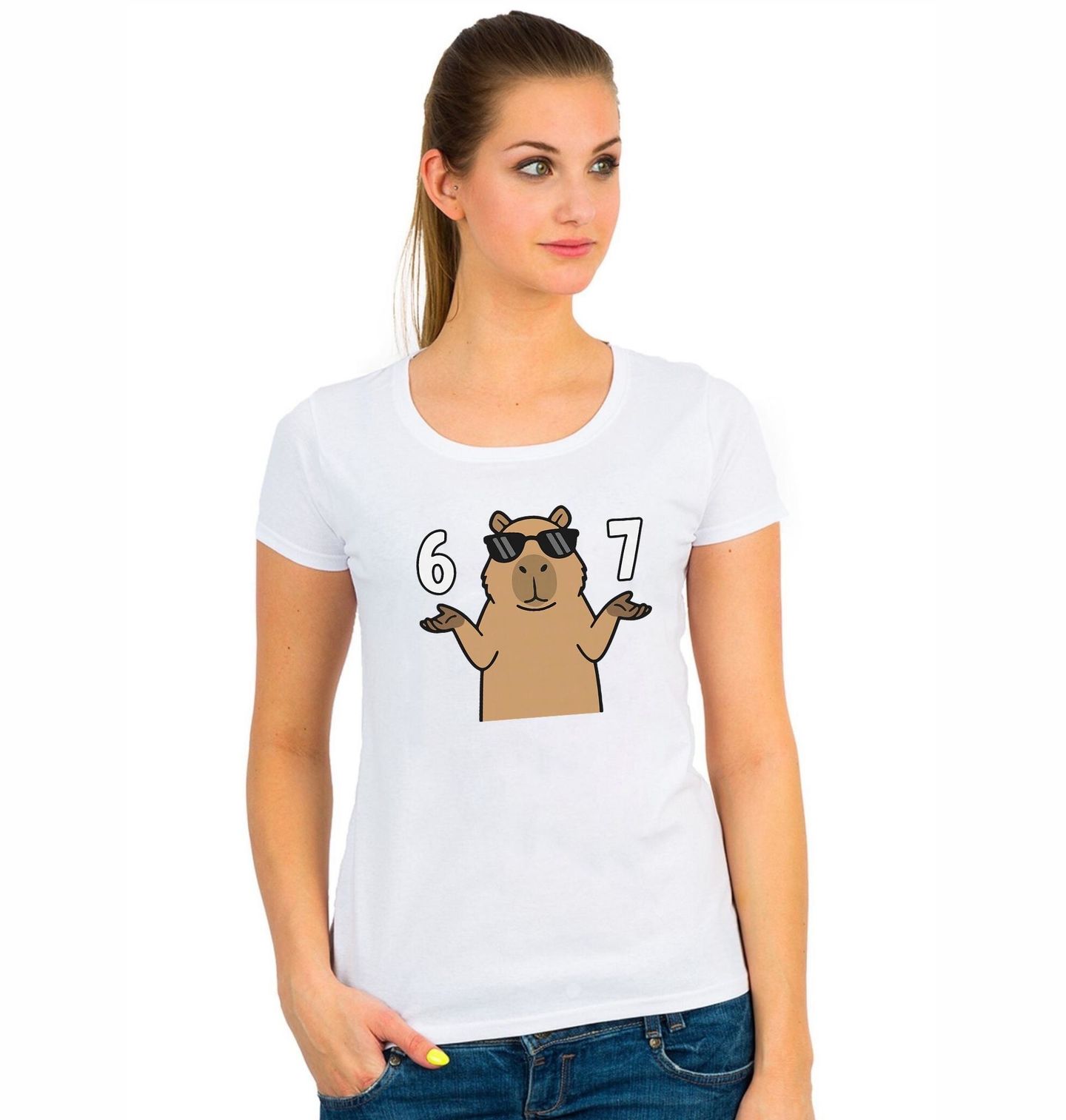 Dámské tričko Kapybara 67 Six Seven Meme. Tento veselý motiv potěší všechny milovníky internetové zábavy – kapybara v tmavých brýlích s klidem vyvažuje čísla 6 a 7 a odkazuje na virální frázi 67 six seven. Kapybara je tady hvězdou a celý design je hravý meme, který přesně vystihuje dnešní internetový brainrot.