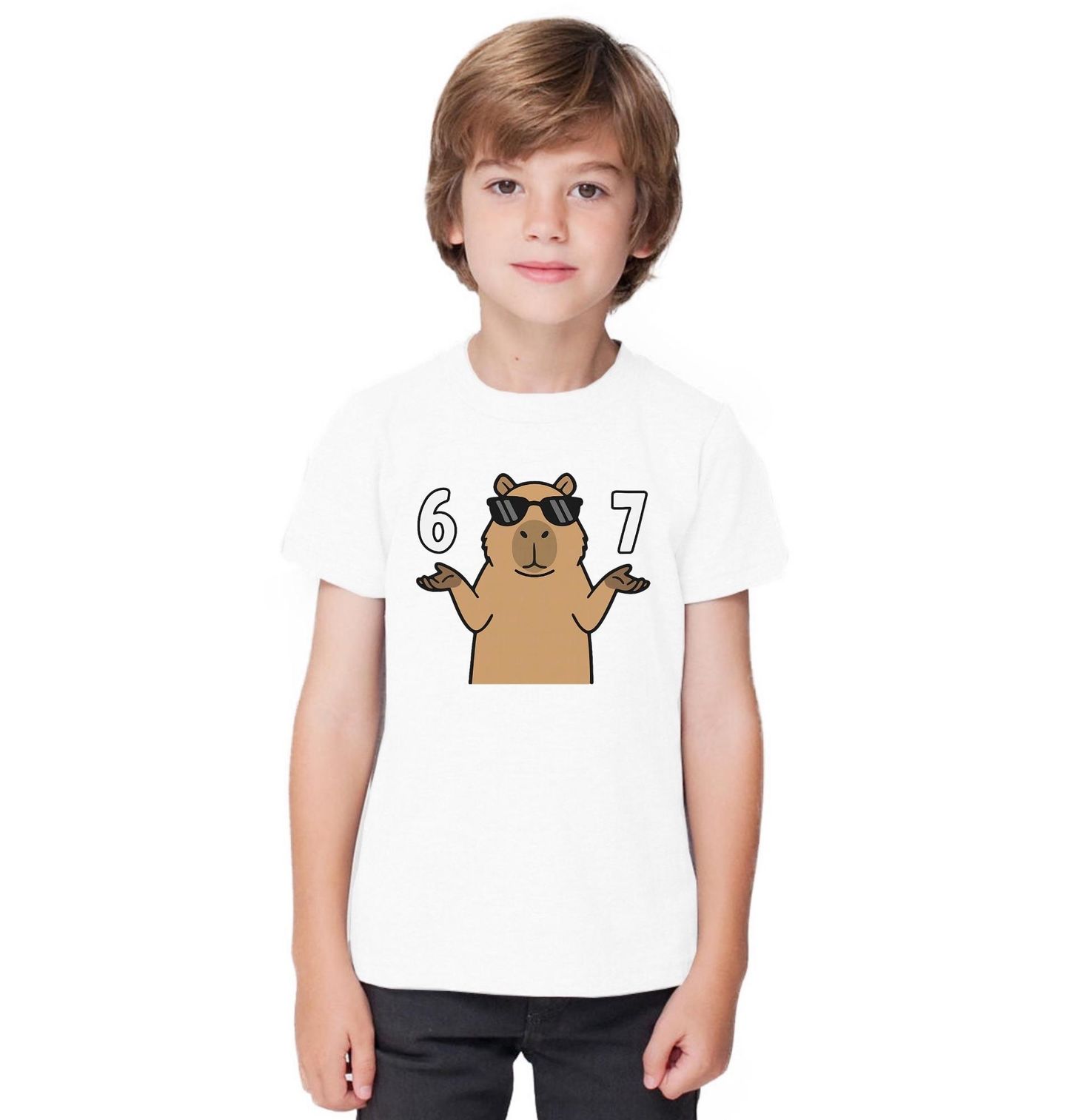 Dětské tričko Kapybara 67 Six Seven Meme. Tento veselý motiv potěší všechny milovníky internetové zábavy – kapybara v tmavých brýlích s klidem vyvažuje čísla 6 a 7 a odkazuje na virální frázi 67 six seven. Kapybara je tady hvězdou a celý design je hravý meme, který přesně vystihuje dnešní internetový brainrot.