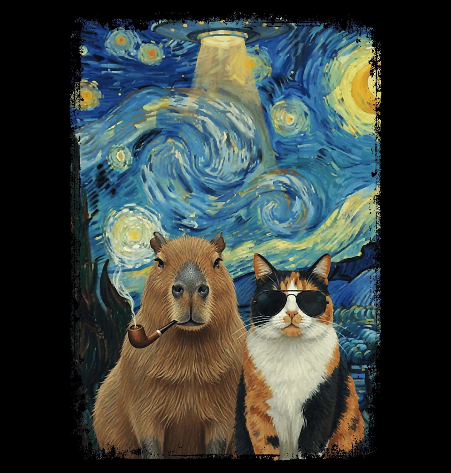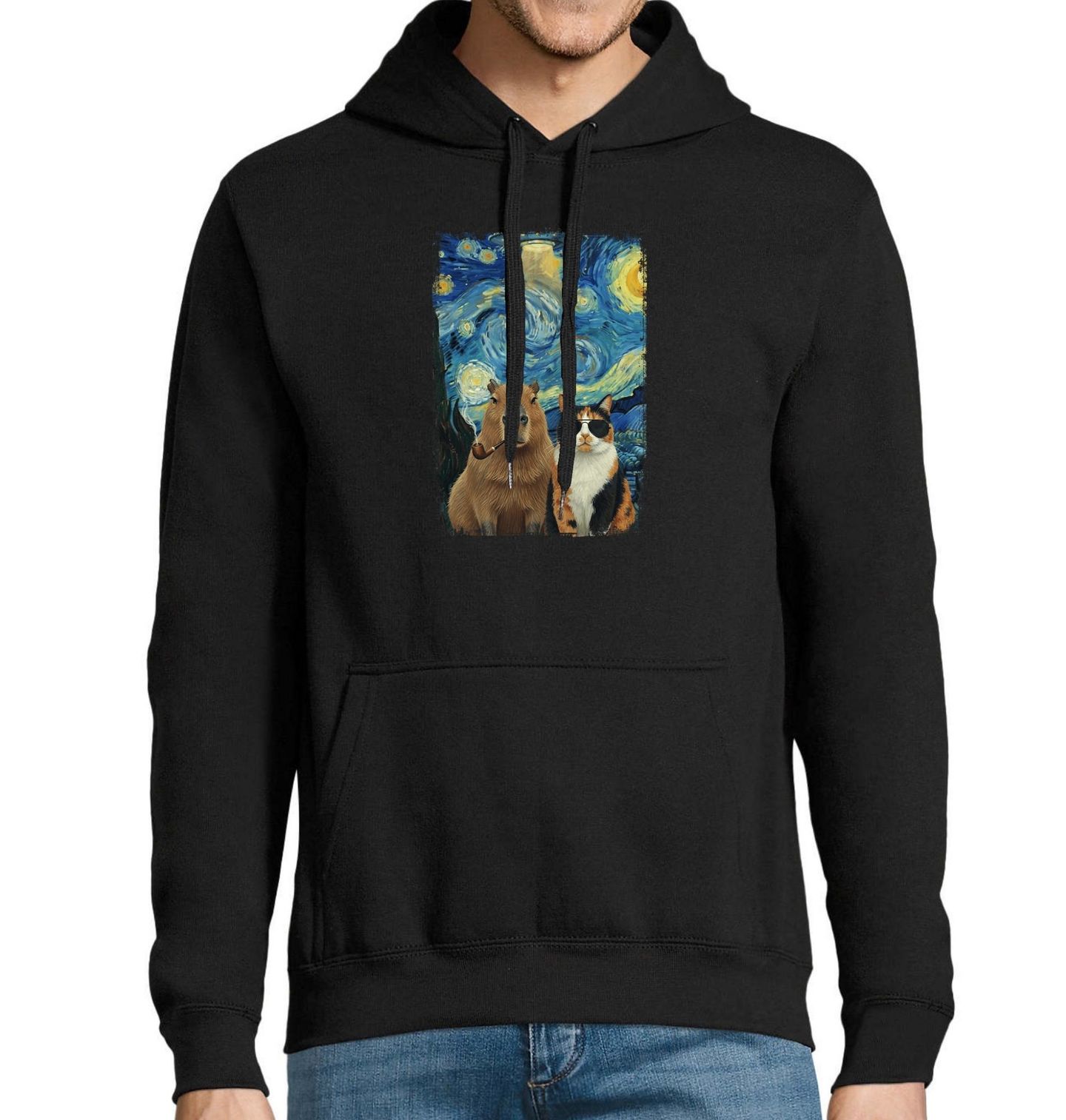 Pánská mikina Kapybara a Kočka ve Hvězdné Noci. Na motivu je klidná kapybara, největší hlodavec na světě, se seriózním výrazem, u které nechybí ani ikonická dýmka. Vedle ní stojí cool kočka v brýlích, připravená na noční dobrodružství. Celé pozadí je výtvarně inspirované obrazem Hvězdná Noc, jehož autorem je Vincent van Gogh.