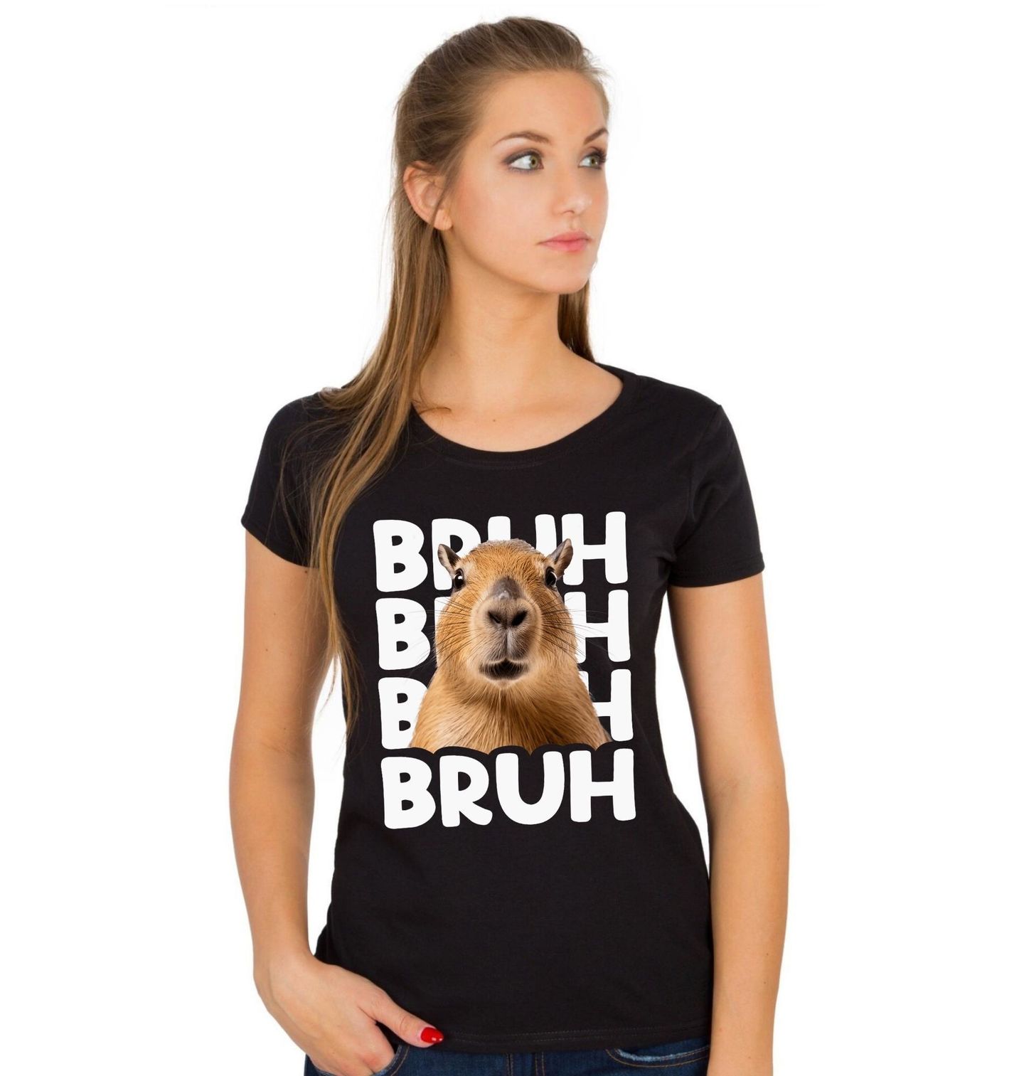 Dámské tričko Kapybara BRUH. Kapybara, největší hlodavec planety, se stala symbolem pohody a klidu. Spojení s nápisem „BRUH“ vystihuje přesně ten moment, kdy už tě nic nepřekvapí. Ideální pro teenagery, milovníky meme kultury i všechny, kdo mají smysl pro humor a styl.