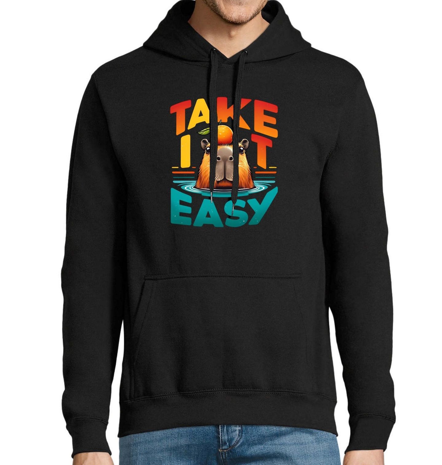 Pánská mikina Kapybara Buď v klidu Take It Easy. Na ilustraci je kapybara částečně ponořená ve vodě s pomerančem na hlavě a nadpisem Take It Easy (česky Vezmi to v klidu). Barevný a hravý design působí jako připomínka, že někdy stačí prostě zpomalit. Tričko je ideální pro každého, kdo miluje kapybara, oceňuje vtipné ilustrace a chce šířit pozitivní náladu.