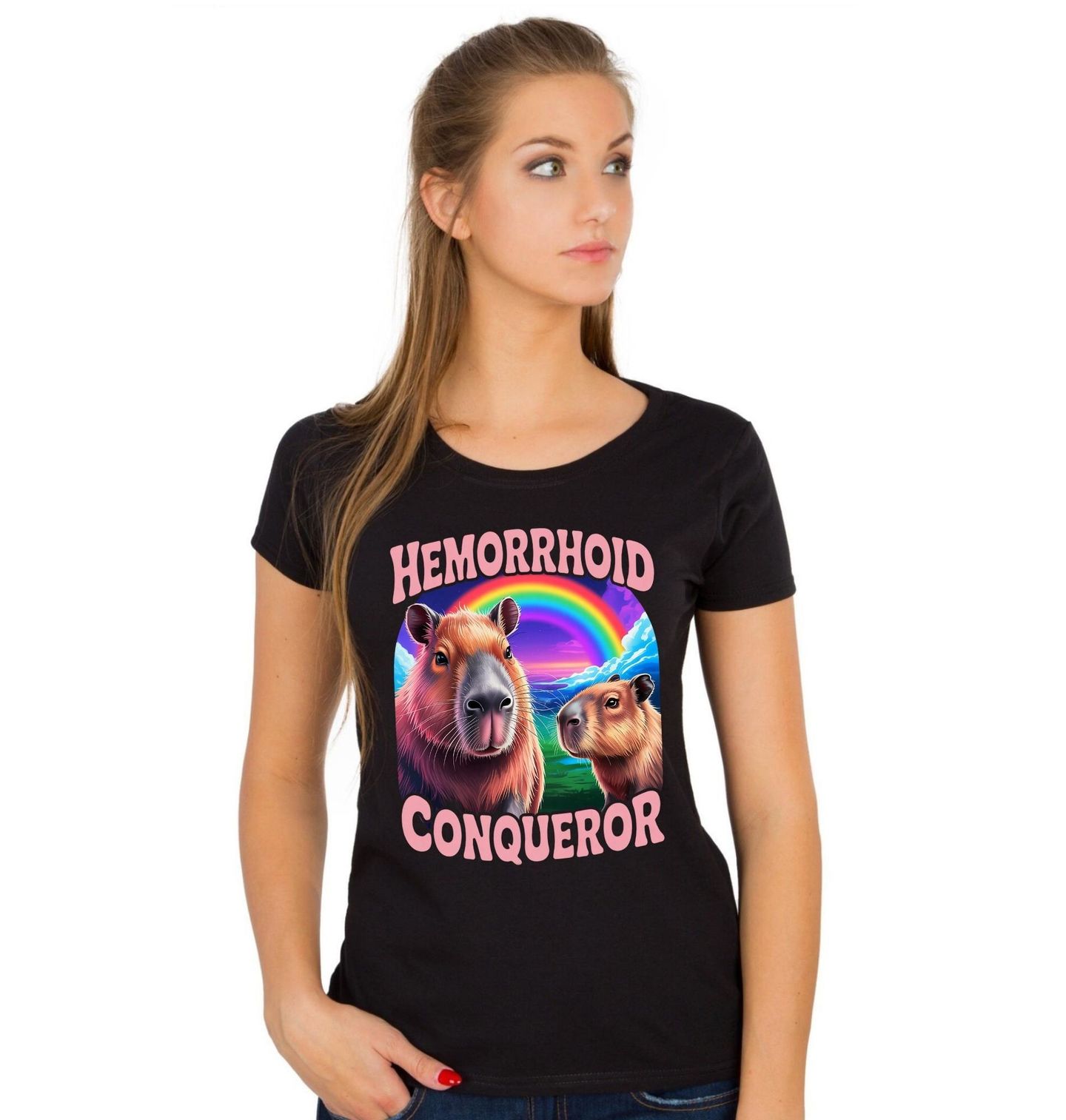 Dámské tričko Kapybara Dobyvatel Hemoroidů. Vtipný design ukazuje dvě roztomilé kapybary před barevnou duhou. Nad nimi je text „Hemorrhoid Conqueror“, který znamená „Dobyvatel hemoroidů“. Kapybara zde symbolizuje humor, nadsázku a pozitivní přístup i k nepříjemným tématům.
