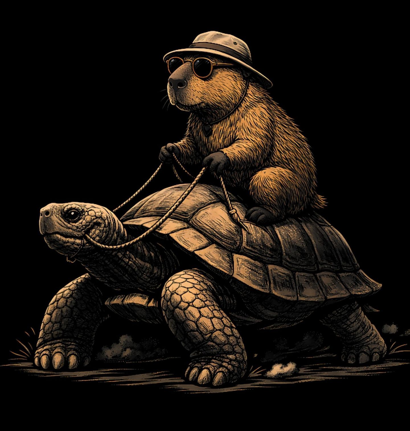 Dámské tričko Kapybara Jezdec Želv. Originální a vtipný motiv zobrazující kapybaru s kloboukem a brýlemi jedoucí na želvě. Tento design působí pohodově a humorně, ideální pro milovníky zvířat a klidného životního stylu. Skvělý design pro každého, kdo má rád nadhled a originalitu.