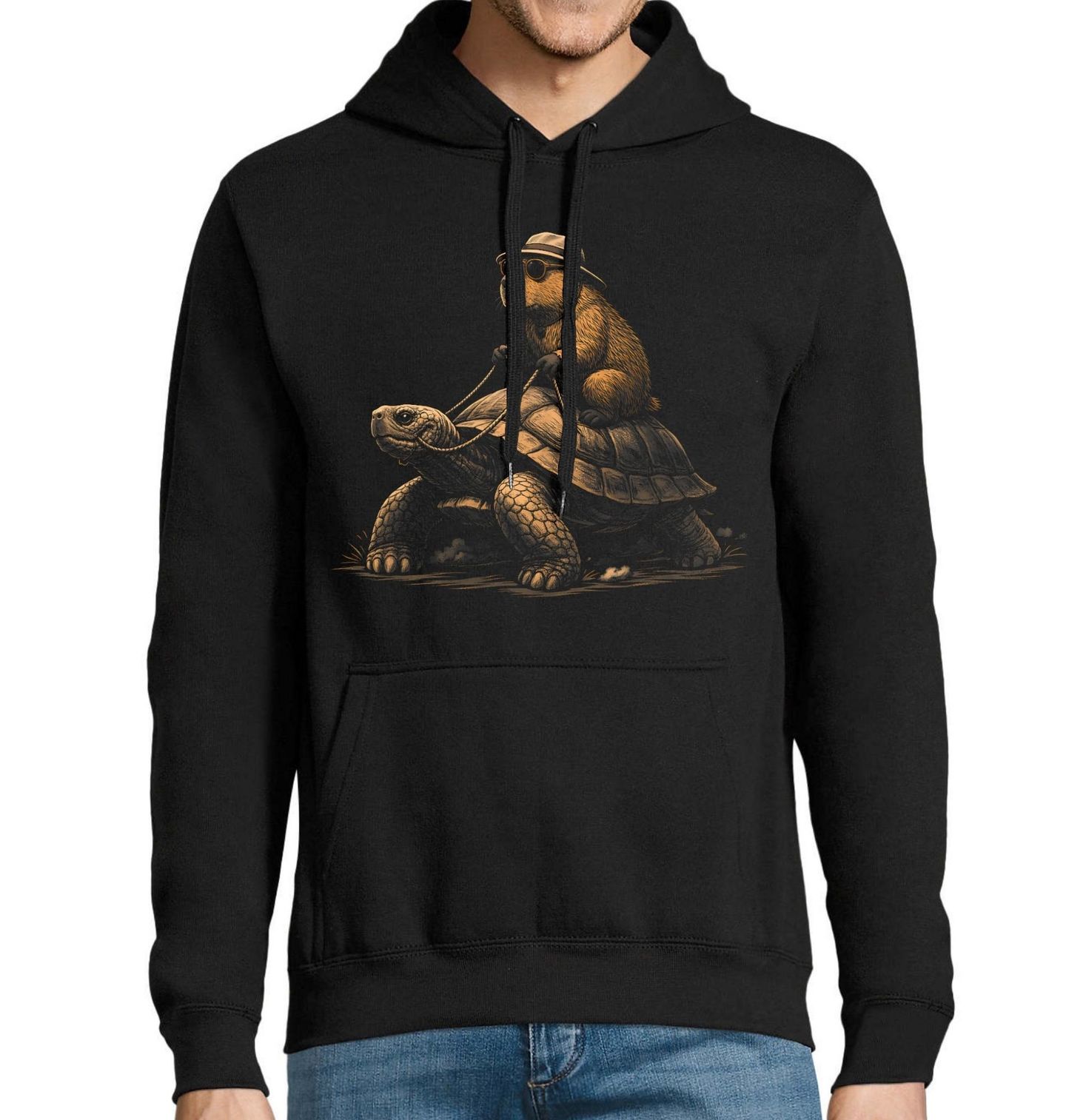 Pánská mikina Kapybara Jezdec Želv. Originální a vtipný motiv zobrazující kapybaru s kloboukem a brýlemi jedoucí na želvě. Tento design působí pohodově a humorně, ideální pro milovníky zvířat a klidného životního stylu. Skvělý design pro každého, kdo má rád nadhled a originalitu.