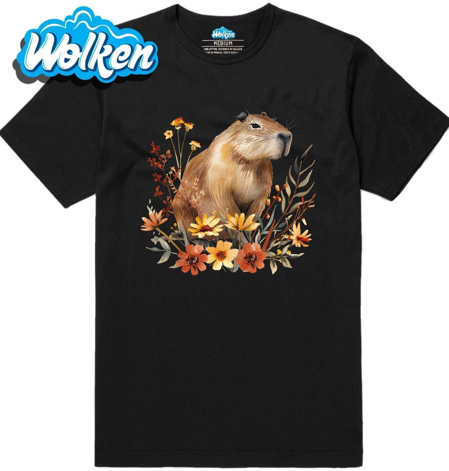 Pánské tričko Kapybara mezi Květy. Rozkošný hlodavec obklopená jemnými květinami přináší harmonii, klid a dotek přírody. Ideální motiv pro milovníky zvířat, pomalého života a pozitivní energie. Kapybara jako symbol pohody a přátelství v barevném květinovém ráji okouzlí na první pohled.