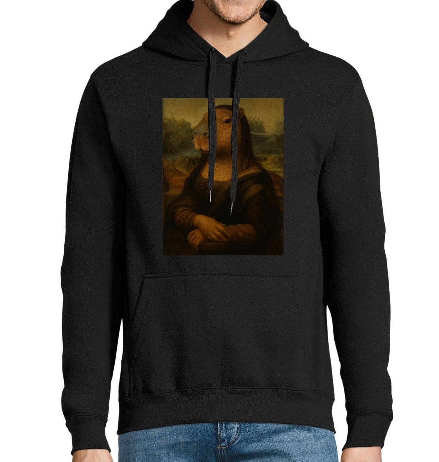 Pánská mikina Kapybara Mona Lisa. Slavná Mona Lisa tentokrát v podání nejklidnějšího zvířete světa – kapybary. Pro milovníky umění, humoru a originálních nápadů. Oblékni si tajemství ukryté za tímto neodolatelným kapybařím úsměvem!