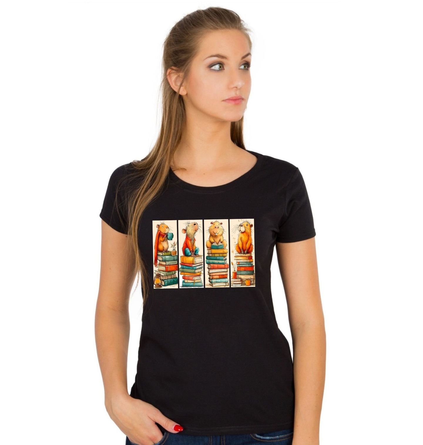 Dámské tričko Kapybara na Hromadě Knih. Hravý a jemně poetický motiv, ve kterém hraje hlavní roli kapybara a barevné knihy. Každá kapybara tu tráví svůj klidný chvilkový svět – s hrnkem teplého nápoje, lampičkou nebo otevřenou knihou v tlapkách. Každá kniha je jinak barevná a velká. Ideální design pro všechny čtenáře, knihomoly i fanoušky klidné atmosféry.