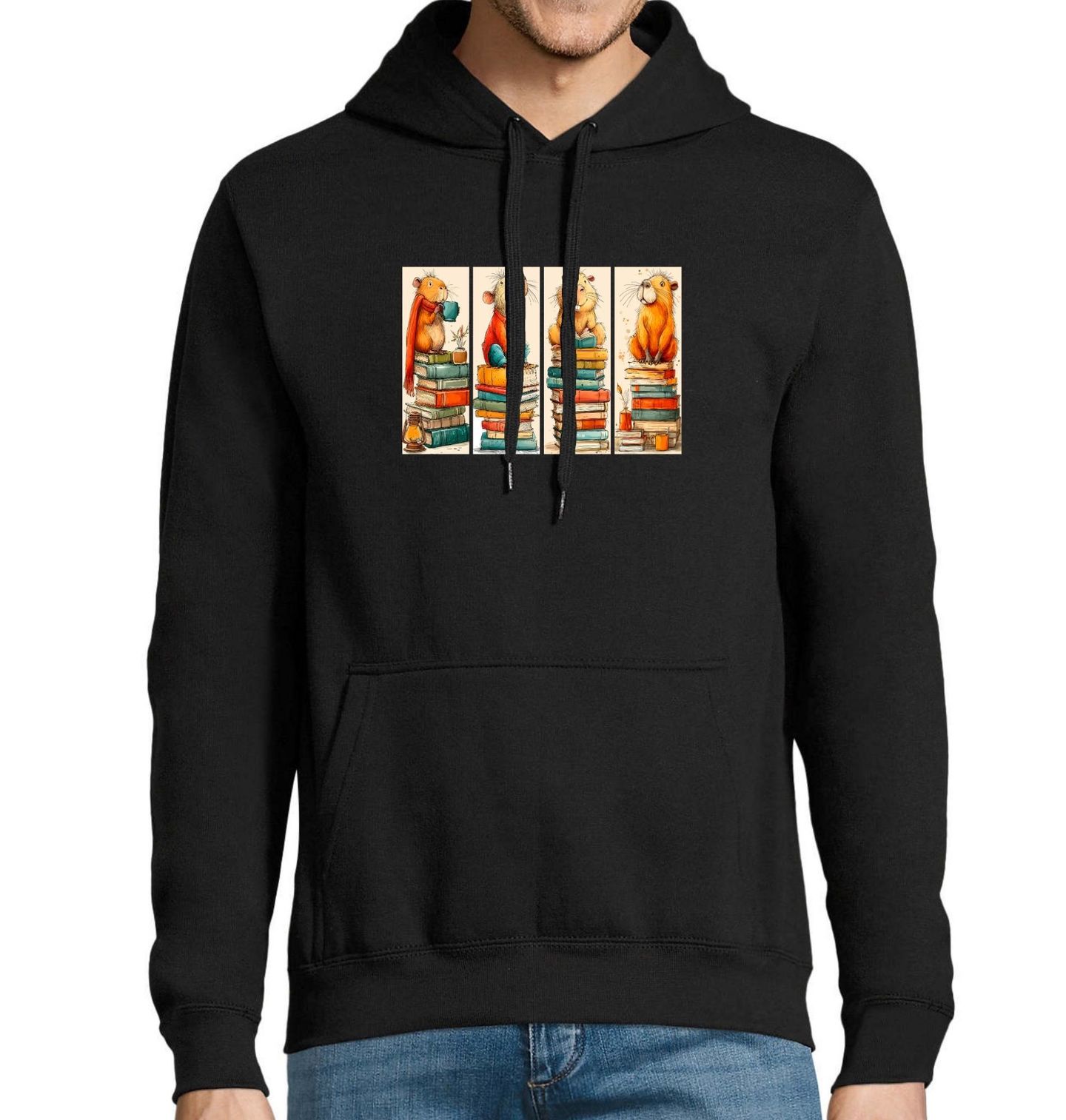 Pánská mikina Kapybara na Hromadě Knih. Hravý a jemně poetický motiv, ve kterém hraje hlavní roli kapybara a barevné knihy. Každá kapybara tu tráví svůj klidný chvilkový svět – s hrnkem teplého nápoje, lampičkou nebo otevřenou knihou v tlapkách. Každá kniha je jinak barevná a velká. Ideální design pro všechny čtenáře, knihomoly i fanoušky klidné atmosféry.