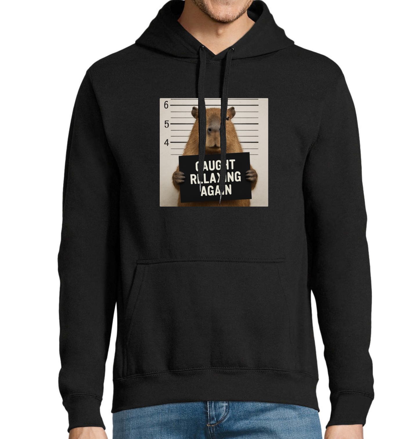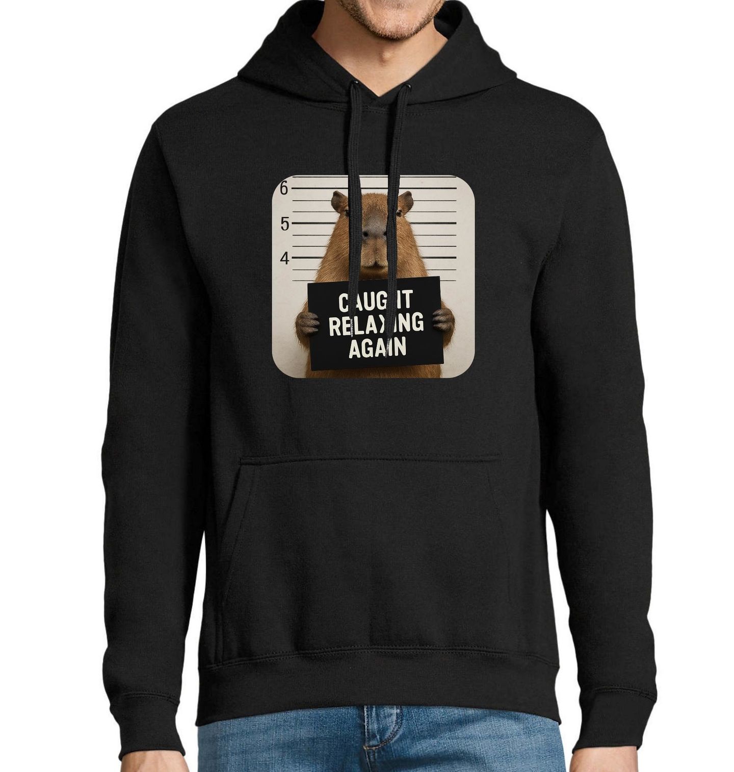 Pánská mikina Kapybara Opět přistižen při relaxaci Busted. Tahle kapybara byla opět přistižena při relaxu – a tentokrát skončila rovnou vežení! Stylový motiv s nápisem Caught relaxing again, který s nadsázkou ukazuje, že i lenošení může být „zločin“. Ideální pro milovníky pohody, zvířat a trošky (ne)vinné lenosti.