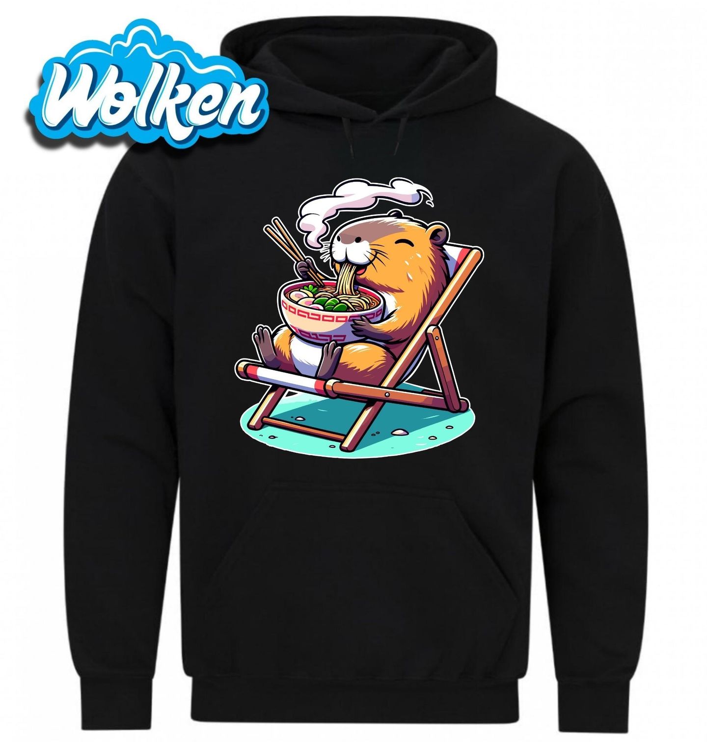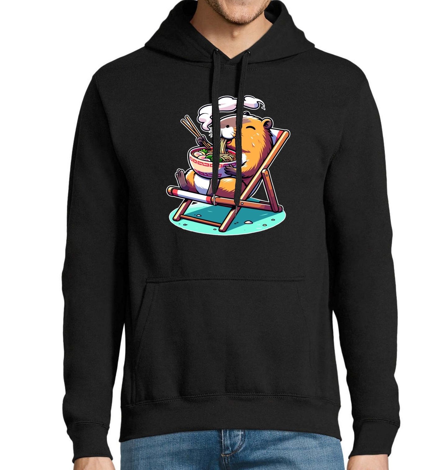 Pánská mikina Kapybara Ramen na lehátku. Kapybara – královna klidu a pohody – si dopřává horkou misku lahodného ramenu a užívá si relax v lehátku. Tento hravý design je perfektní pro milovníky kapybar, dobrého jídla a chill vibe! Skvělý dárek pro foodie nadšence, milovníky asijské kuchyně i všechny, kteří žijí podle motta „Keep calm and slurp ramen!