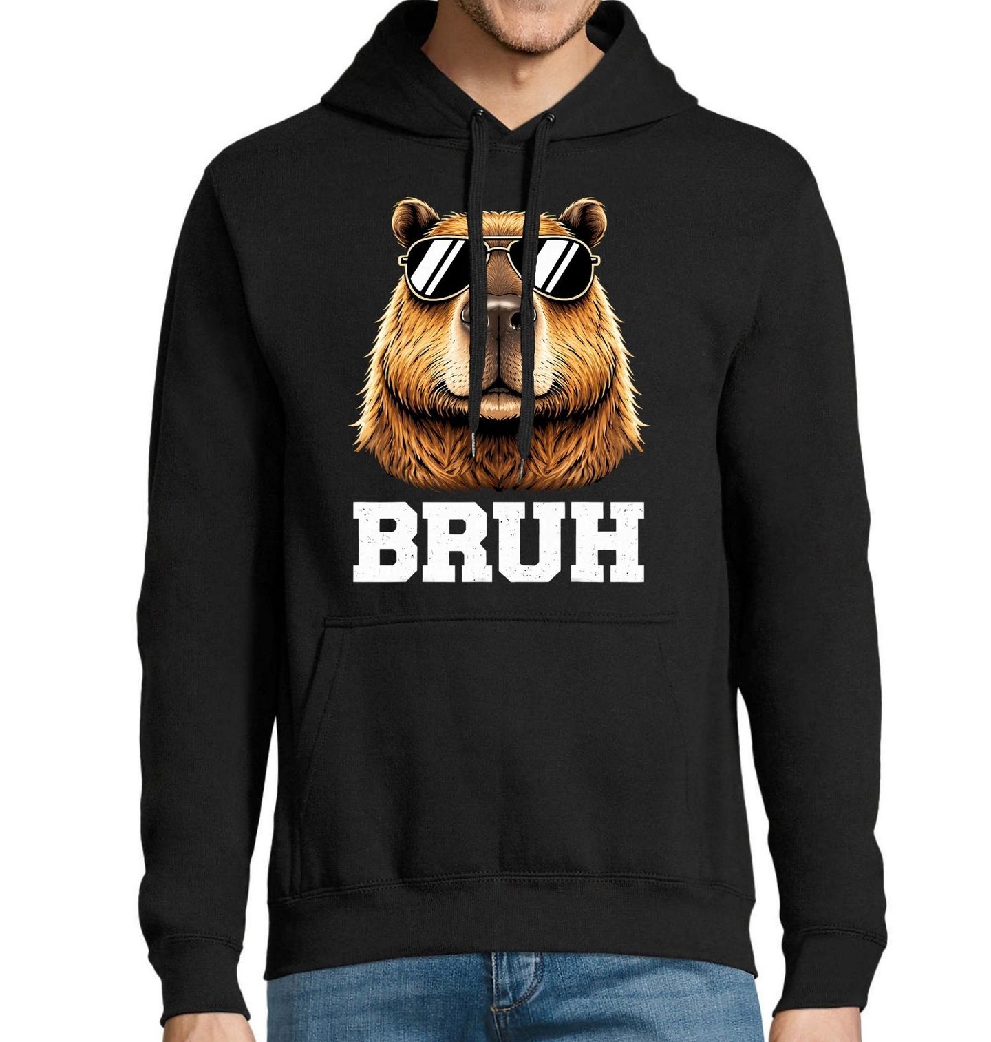 Pánská mikina Kapybara s Brýlemi Bruh. Stylový motiv zobrazuje sebevědomou kapybaru s velkými slunečními brýlemi a nápisem „BRUH“. Slovo „Bruh“ je slangový výraz podobný českému „kámo“ nebo „ty jo“, používaný v humorných situacích. Kapybara v designu působí uvolněně, cool a dodává motivu moderní internetový humor.