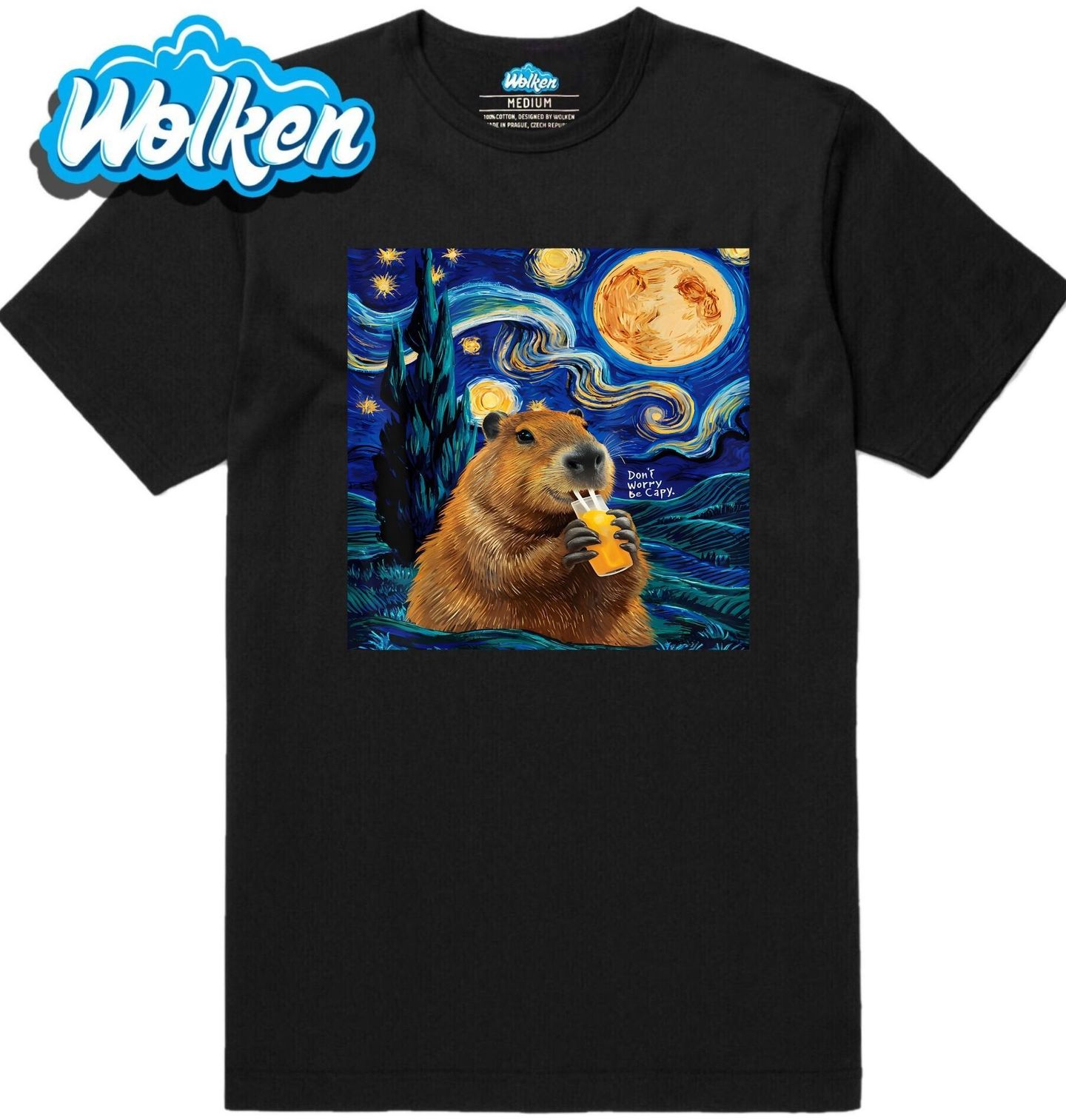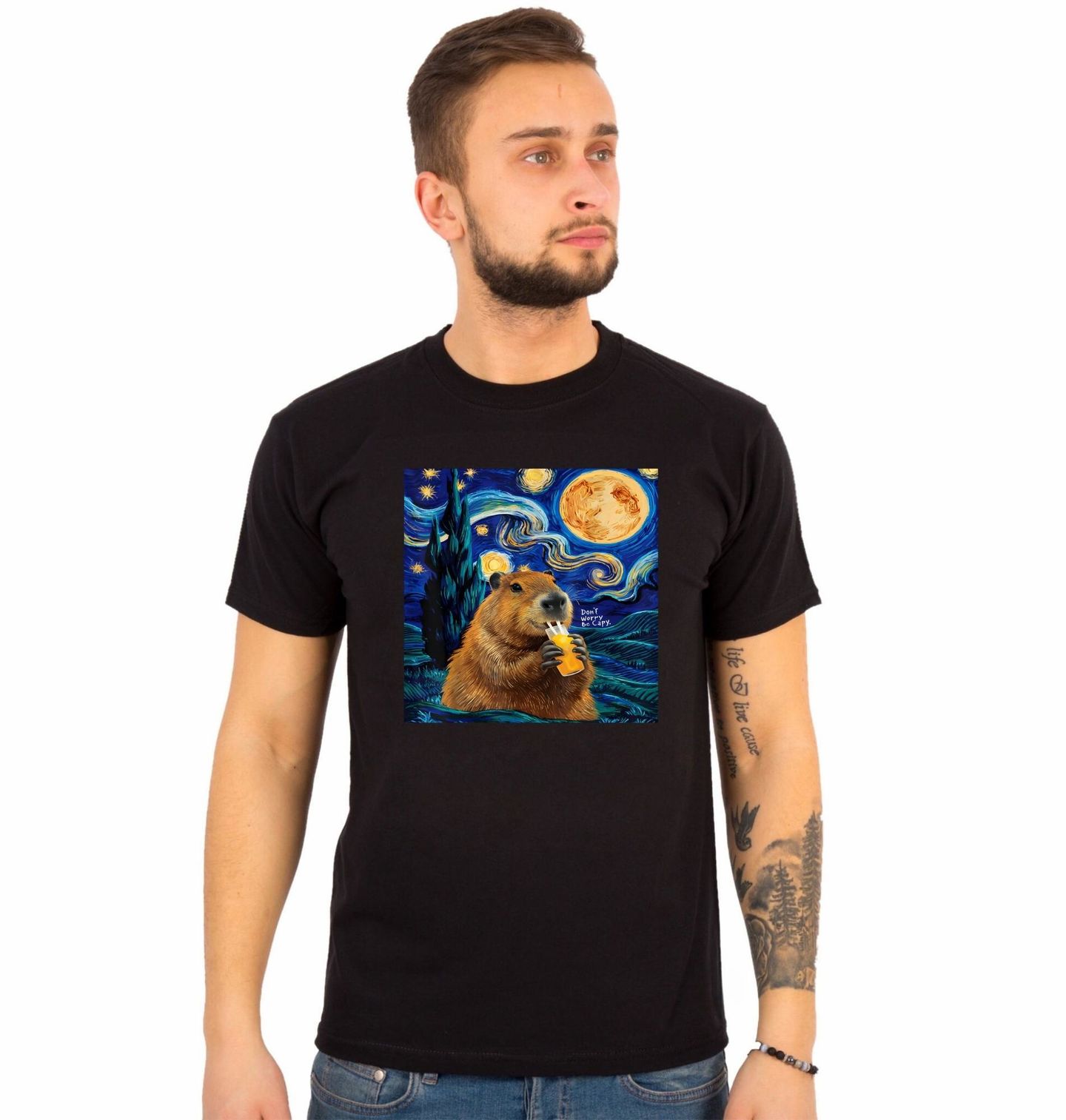 Pánské tričko Kapybara s Džusem ve Hvězdné noci. Když se setká klid kapybary, legendární hlodavec, s ikonickým dílem Hvězdná noc od Vincenta van Gogha, vznikne magický motiv, který rozzáří nejen tvůj šatník, ale i náladu. Tahle kapybara si vychutnává svůj drink pod hvězdnou oblohou a připomíná ti jednoduchou pravdu: „Don’t worry, be capy.“