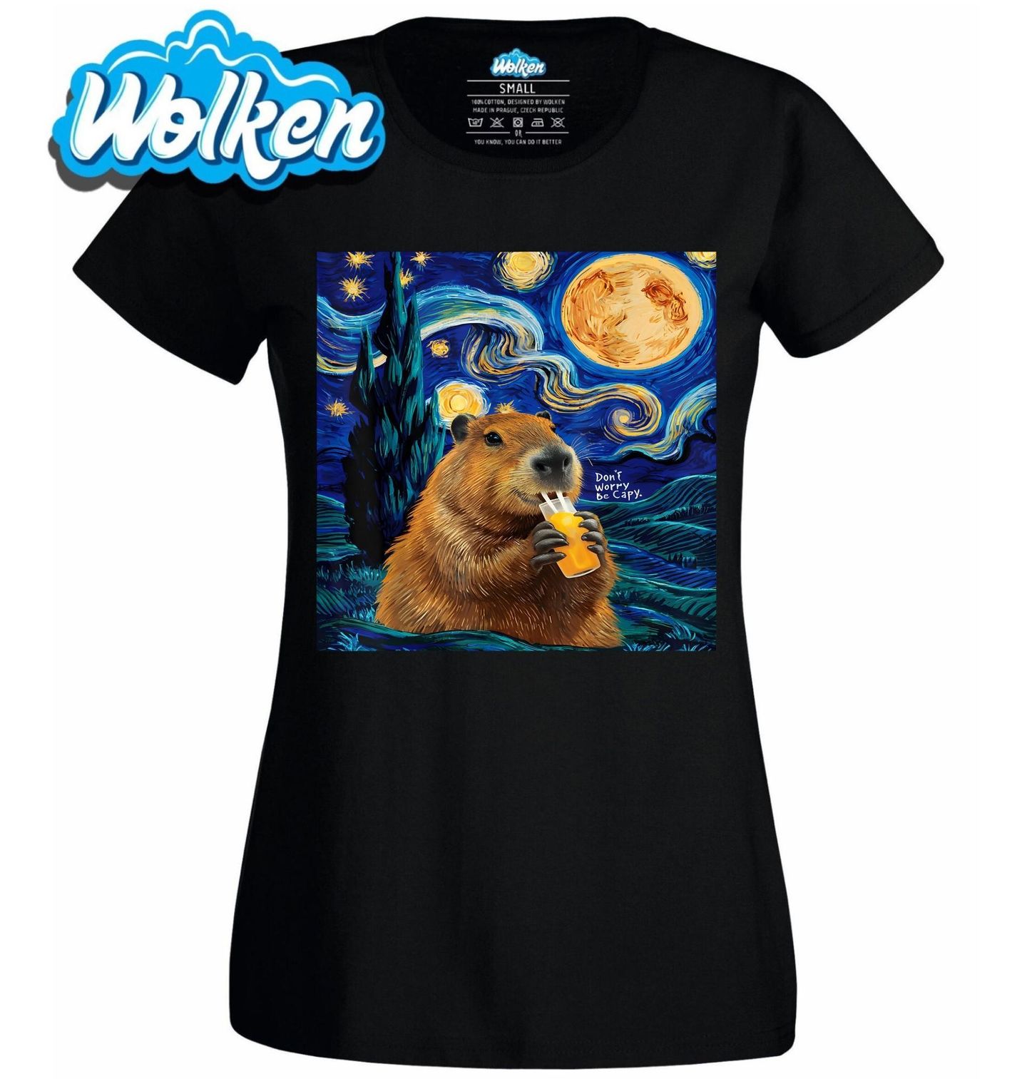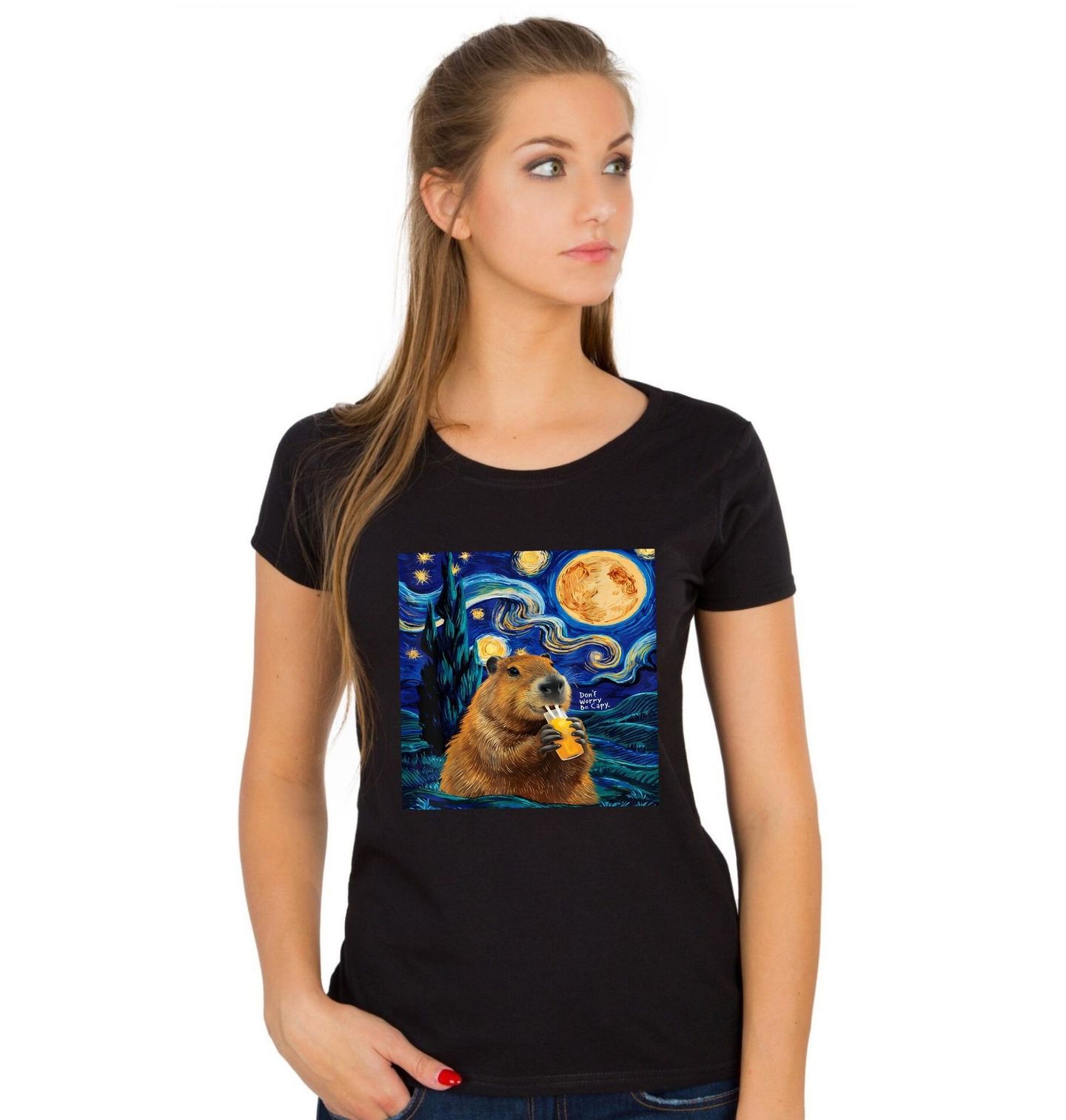 Dámské tričko Kapybara s Džusem ve Hvězdné noci. Když se setká klid kapybary, legendární hlodavec, s ikonickým dílem Hvězdná noc od Vincenta van Gogha, vznikne magický motiv, který rozzáří nejen tvůj šatník, ale i náladu. Tahle kapybara si vychutnává svůj drink pod hvězdnou oblohou a připomíná ti jednoduchou pravdu: „Don’t worry, be capy.“