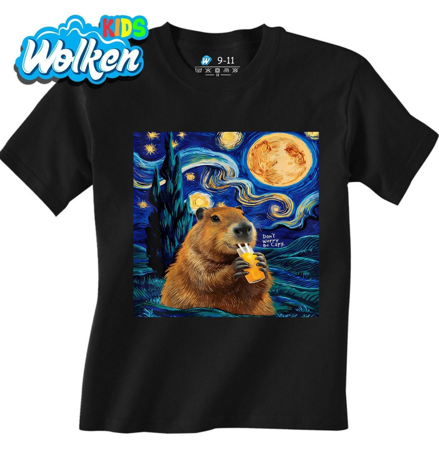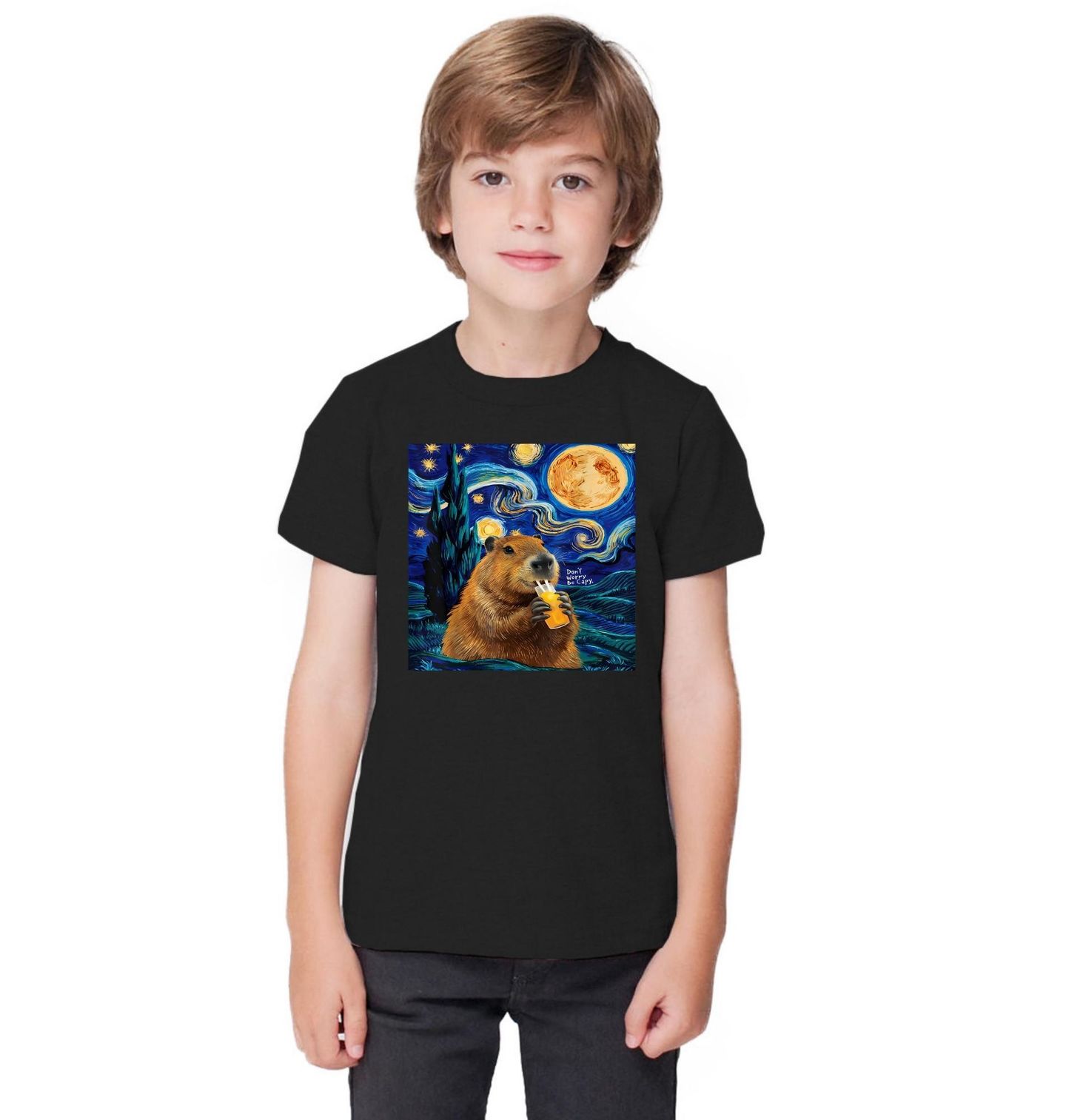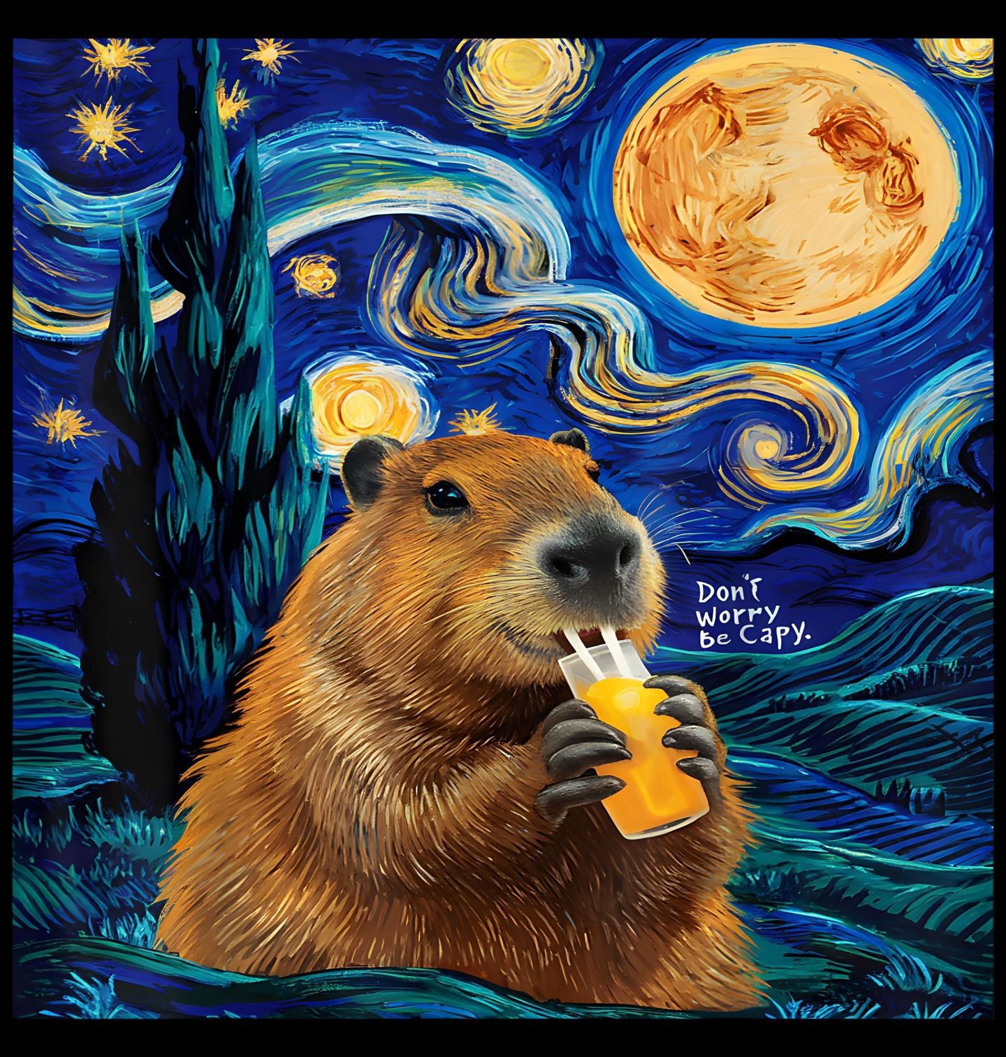 Dětské tričko Kapybara s Džusem ve Hvězdné noci. Když se setká klid kapybary, legendární hlodavec, s ikonickým dílem Hvězdná noc od Vincenta van Gogha, vznikne magický motiv, který rozzáří nejen tvůj šatník, ale i náladu. Tahle kapybara si vychutnává svůj drink pod hvězdnou oblohou a připomíná ti jednoduchou pravdu: „Don’t worry, be capy.“
