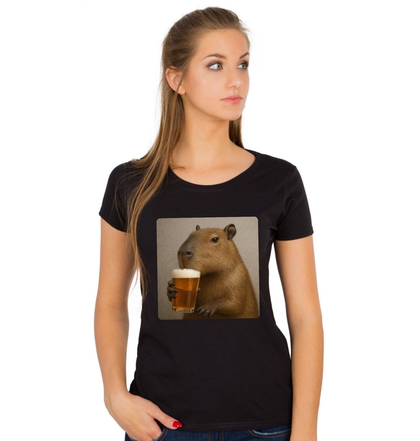 Dámské tričko Kapybara s Pivem. Pokud miluješ originální a zábavné motivy, tahle kombinace tě dostane! Kapybara je známá jako nejvíc chill hlodavec na světě a v tomhle designu si vychutnává dobře vychlazené pivo. Ideální pro všechny fanoušky relaxu, humoru a netradičních potisků.