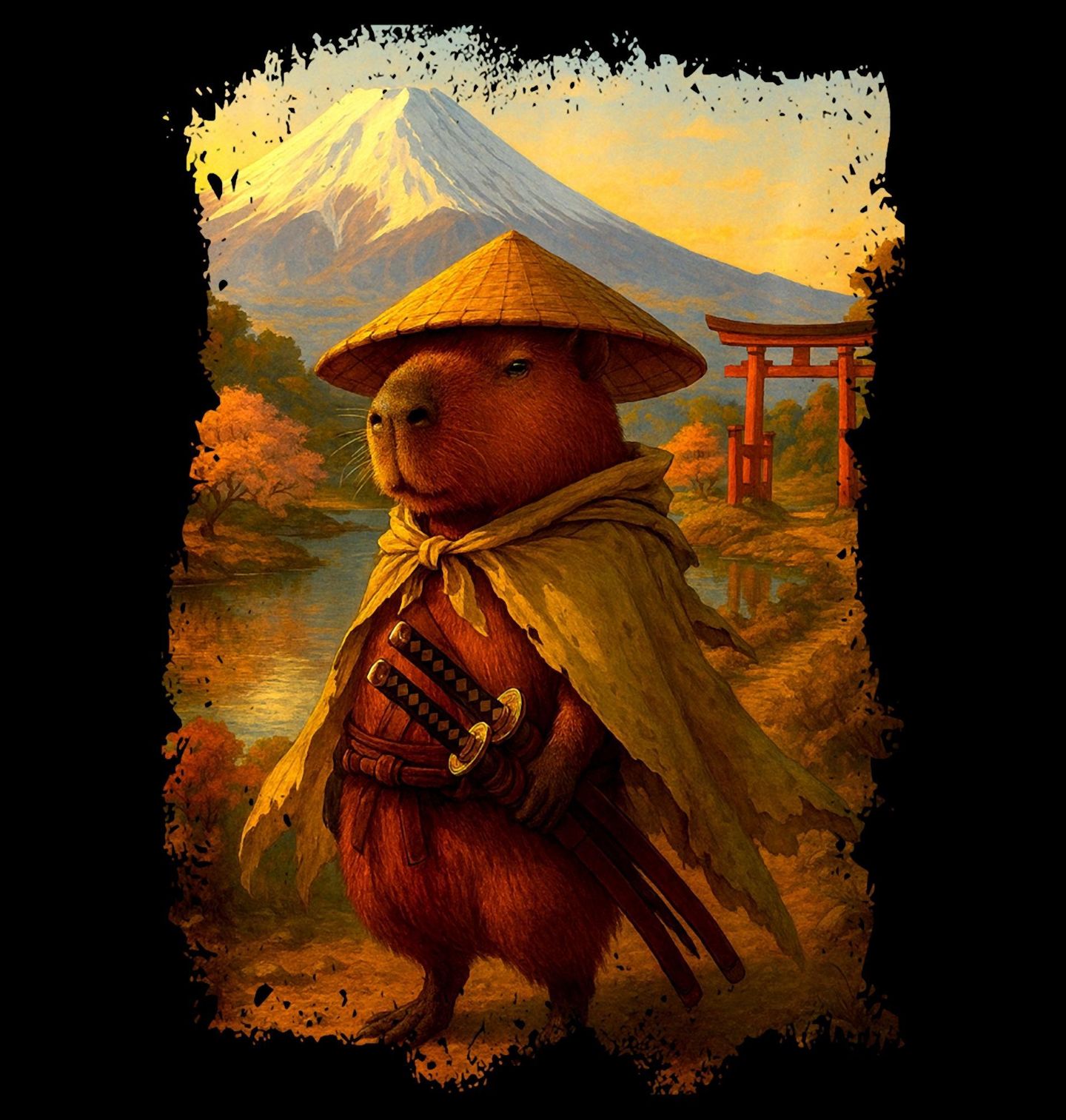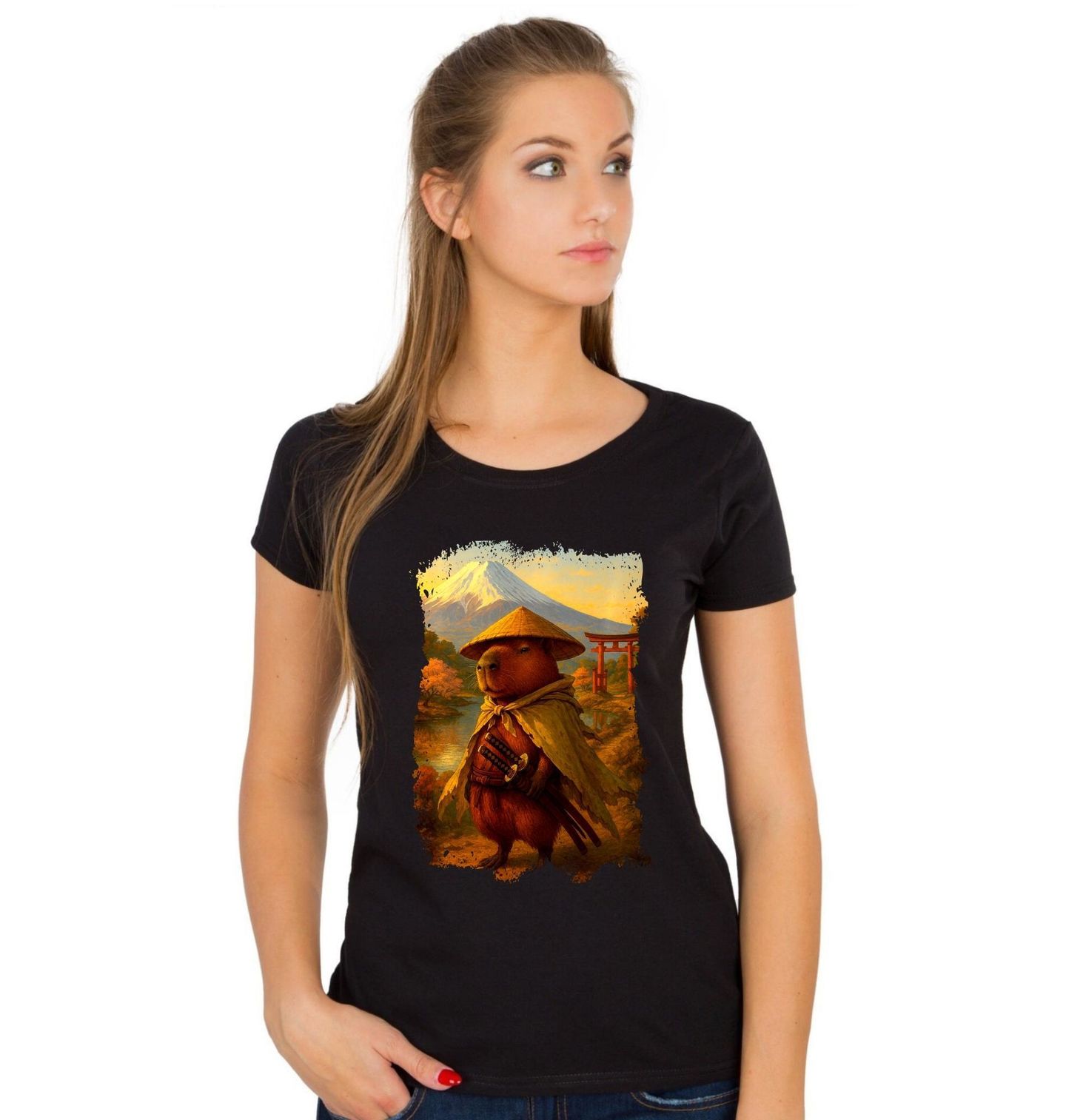 Dámské tričko Kapybara Samuraj. Hrdý hlodavec ve zbroji samuraje stojí v malebné japonské krajině s horou Fudži v pozadí a meči u pasu. Tento epický motiv spojuje klid a moudrost kapybary s odvahou a čestností japonských bojovníků. Ideální pro ty, co milují Japonsko a kapybary.