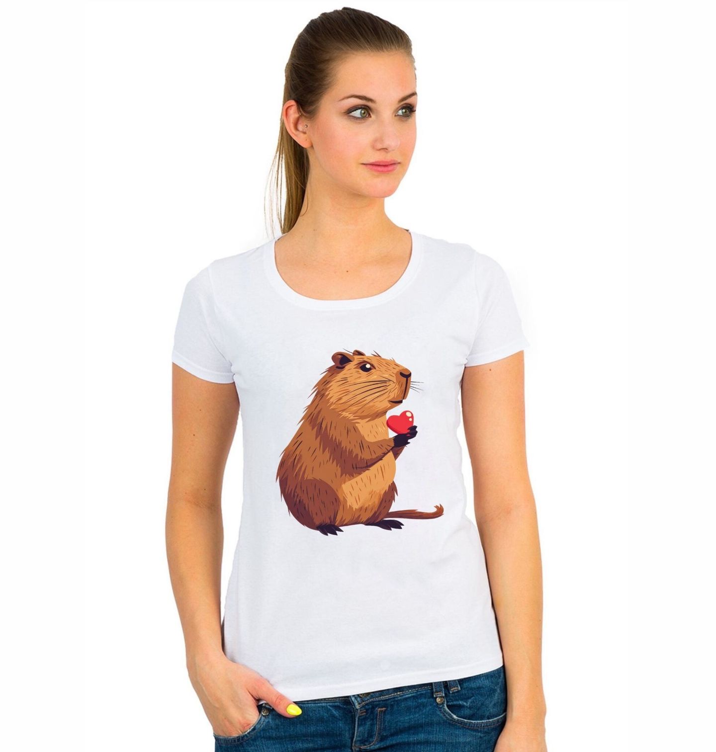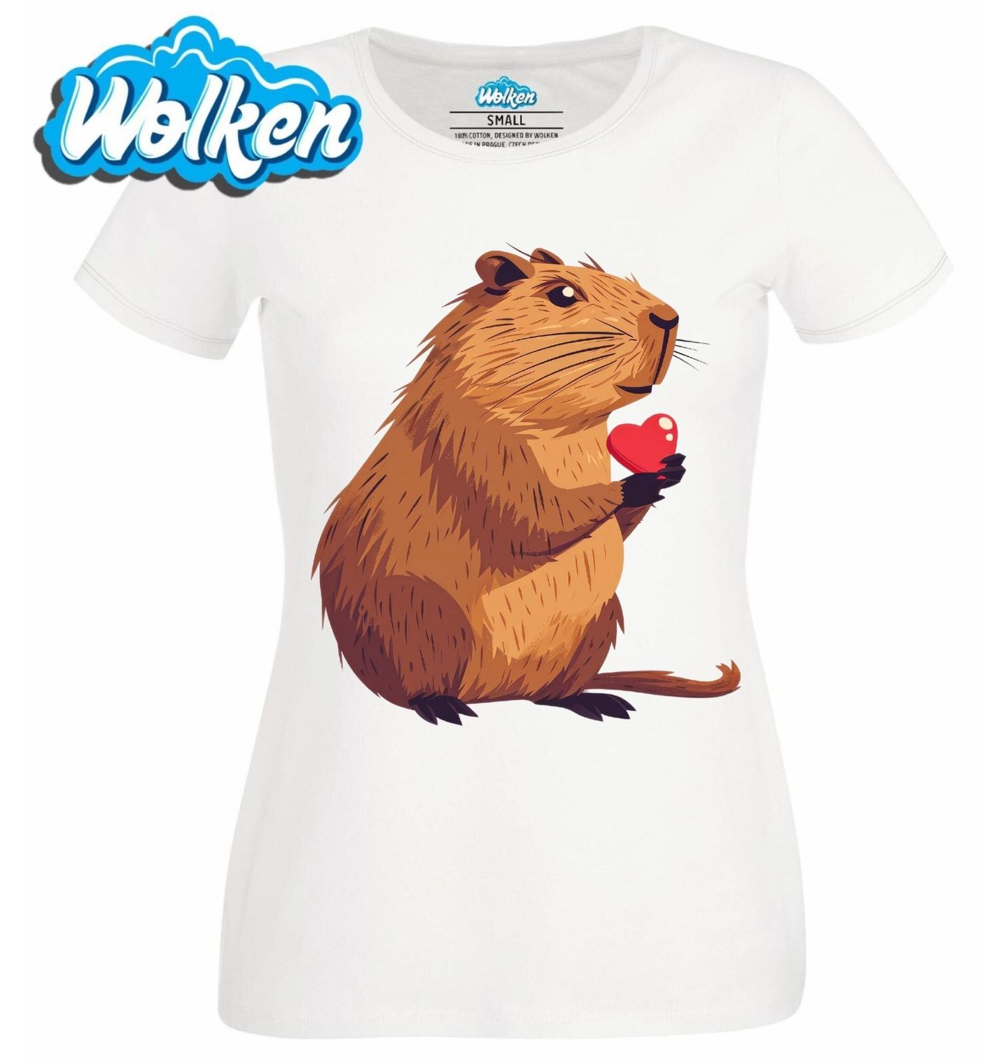Dámské tričko Kapybara se Srdem. Roztomilý motiv, kde kapybara – největší hlodavec světa – drží srdce jako symbol lásky a klidu. Ideální pro každého milovníka zvířat, který chce ukázat svou náklonnost nejen ke kapybaře, ale i ke světu kolem sebe. Kapybara jako hlodavec s velkým srdcem vám zlepší den i outfit.