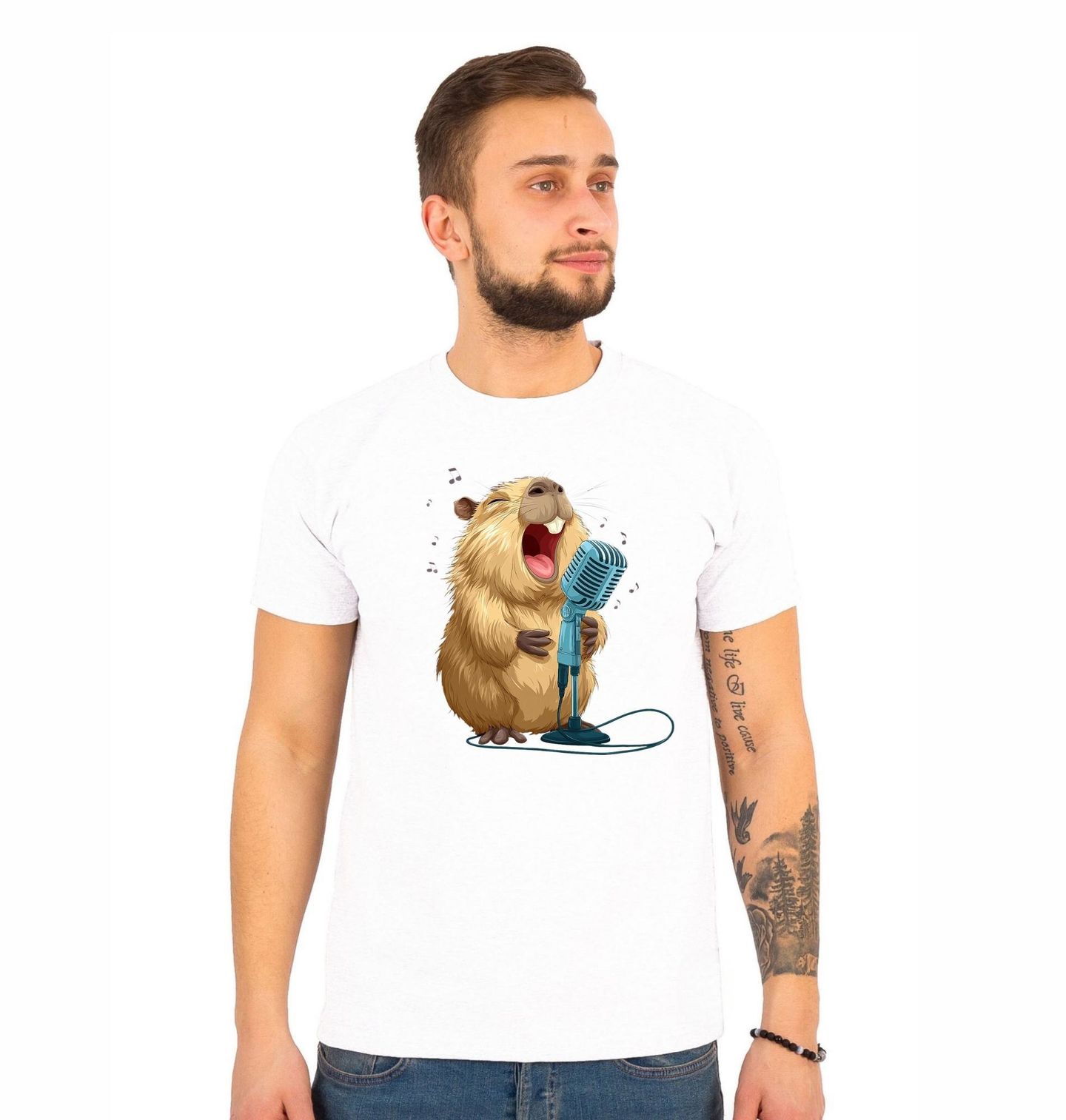 Pánské tričko Kapybara Superstar. Veselý motiv zachycuje kapybaru, která si naplno užívá zpěv do mikrofonu. Hudební ilustrace plná energie a radosti zaujme každého milovníka hudby. Kapybara zpěvák přináší hravost, pozitivní náladu a originalitu.