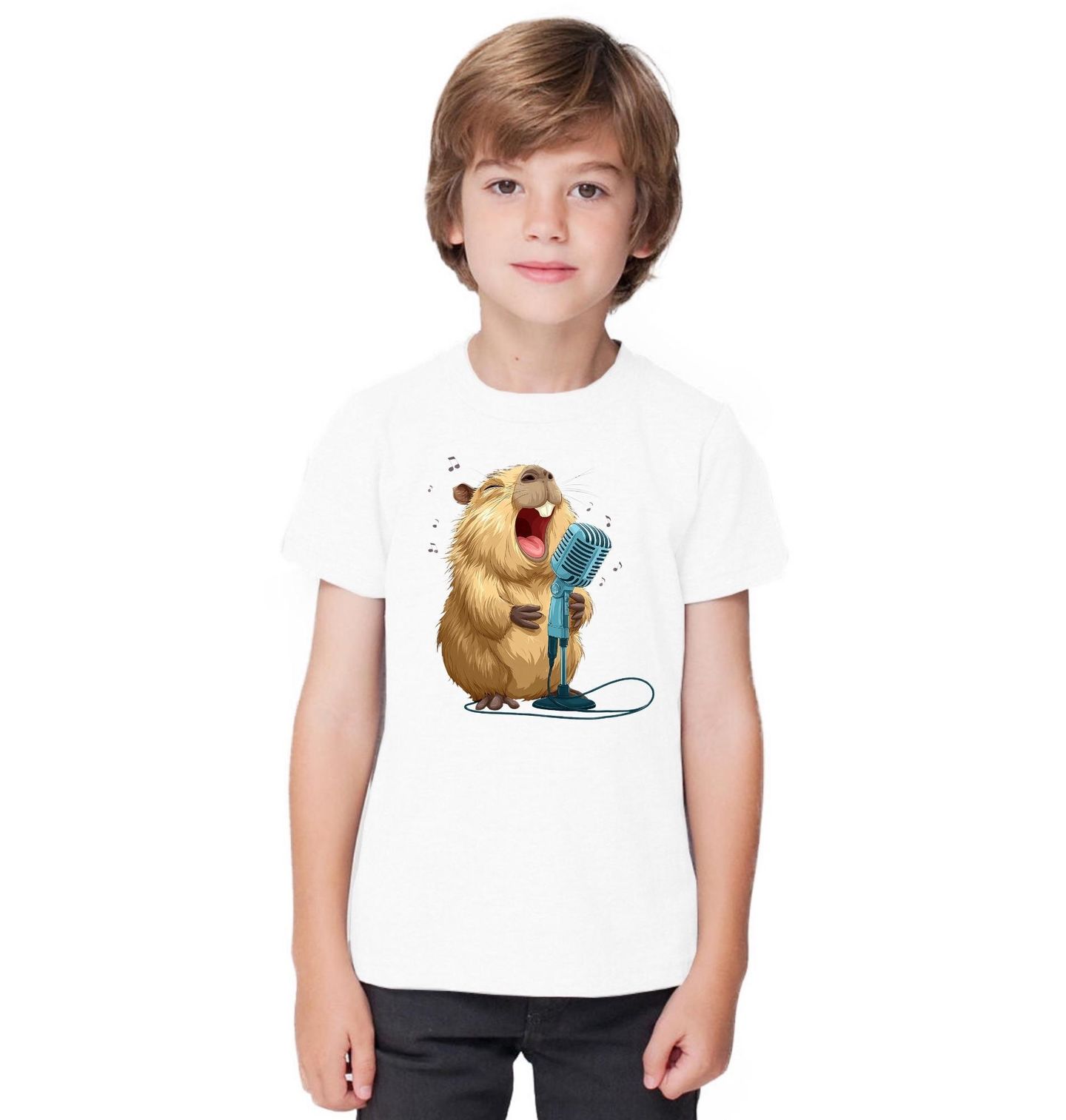 Dětské tričko Kapybara Superstar. Veselý motiv zachycuje kapybaru, která si naplno užívá zpěv do mikrofonu. Hudební ilustrace plná energie a radosti zaujme každého milovníka hudby. Kapybara zpěvák přináší hravost, pozitivní náladu a originalitu.