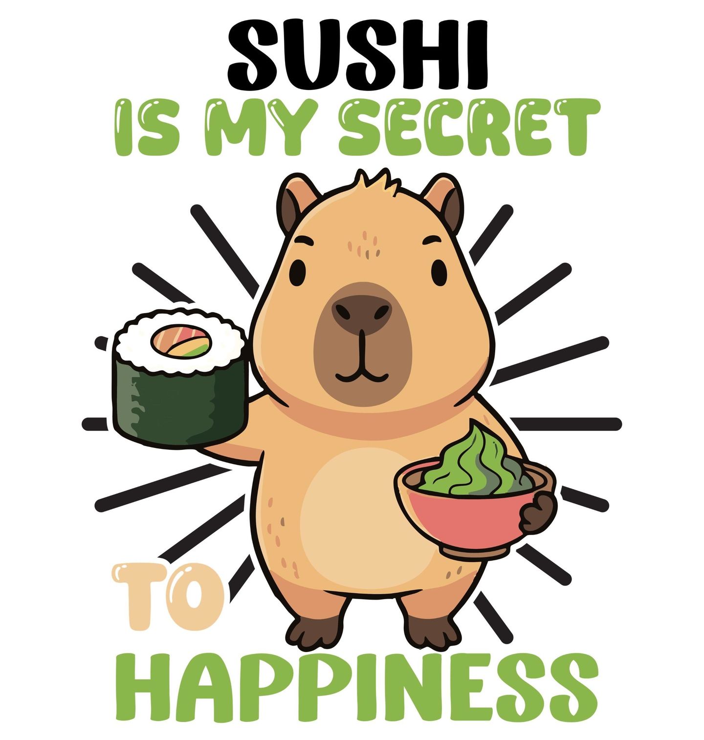 Dětské tričko Kapybara Sushi je moje tajemství ke štěstí. Roztomilá ilustrace zvířátka (kapybara styl) držící sushi a misku s jídlem doplněná textem „Sushi is my secret to happiness“ (Sushi je moje tajemství ke štěstí). Tento hravý motiv „sushi“ potěší každého milovníka japonské kuchyně a roztomilých ilustrací. Ideální pro milovníky sushi.