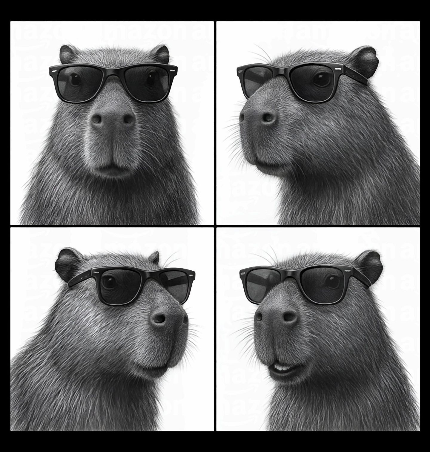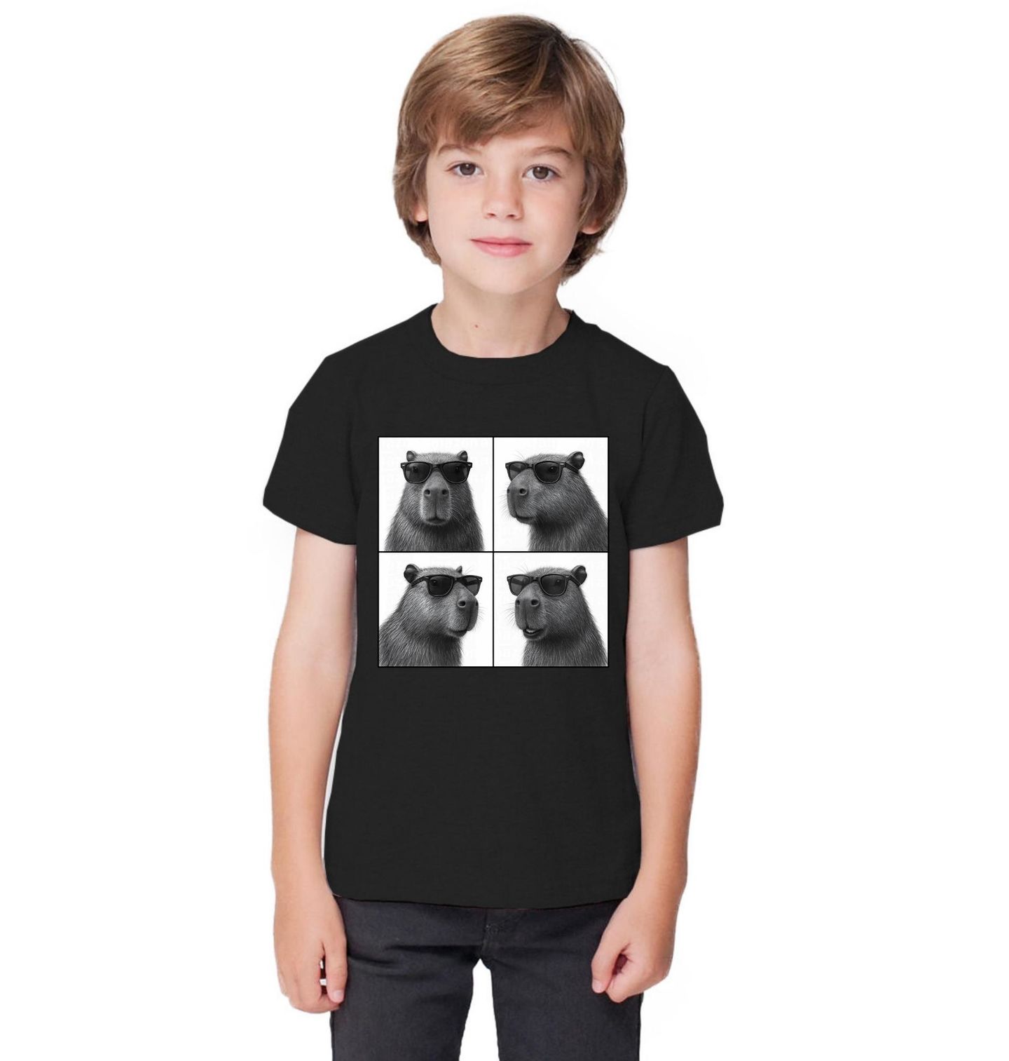 Dětské tričko Kapybara v Brýlích. Čtyři pózy, jedna legenda. Stylový hlodavec v černých brýlích září na tomto černobílém motivu jako ikona klidu a nadhledu. Minimalistické provedení a cool výraz dělají z této ilustrace ideální kousek pro každého, kdo miluje kapybaru a humor s dávkou stylu.