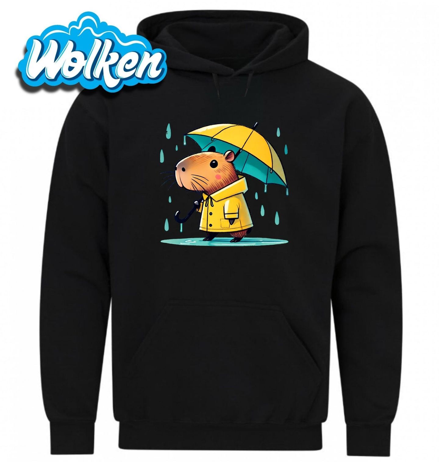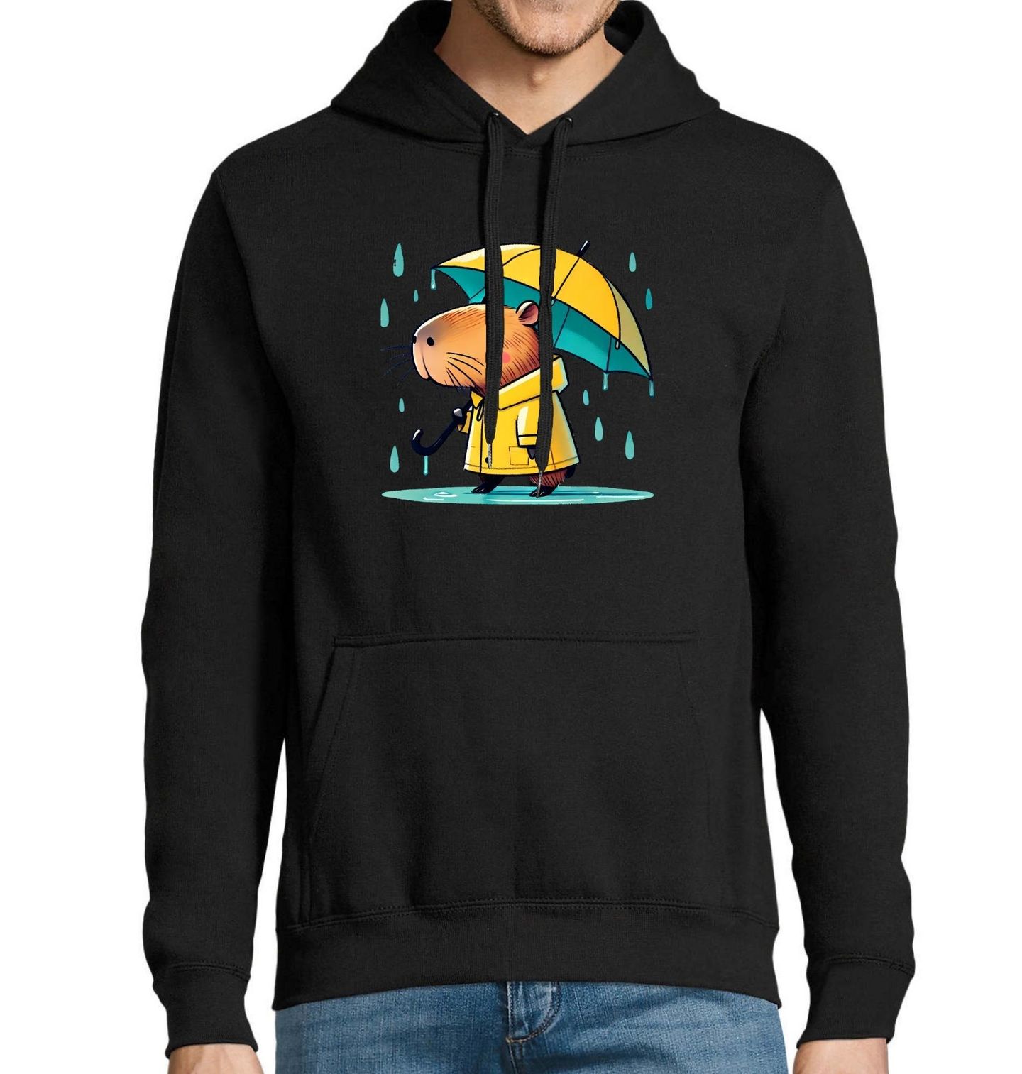 Pánská mikina Kapybara v dešti. Roztomilá kapybara v žluté pláštěnce a s deštníkem ti připomene, že i déšť může být krásný – když ho přijmeš s nadhledem a suchými tlapkami. Ideální pro milovníky pohodových zvířátek, podzimních procházek i mokrého počasí s úsměvem. Když prší, kapybara netrpí. Jen si vezme pláštěnku a jde dál.