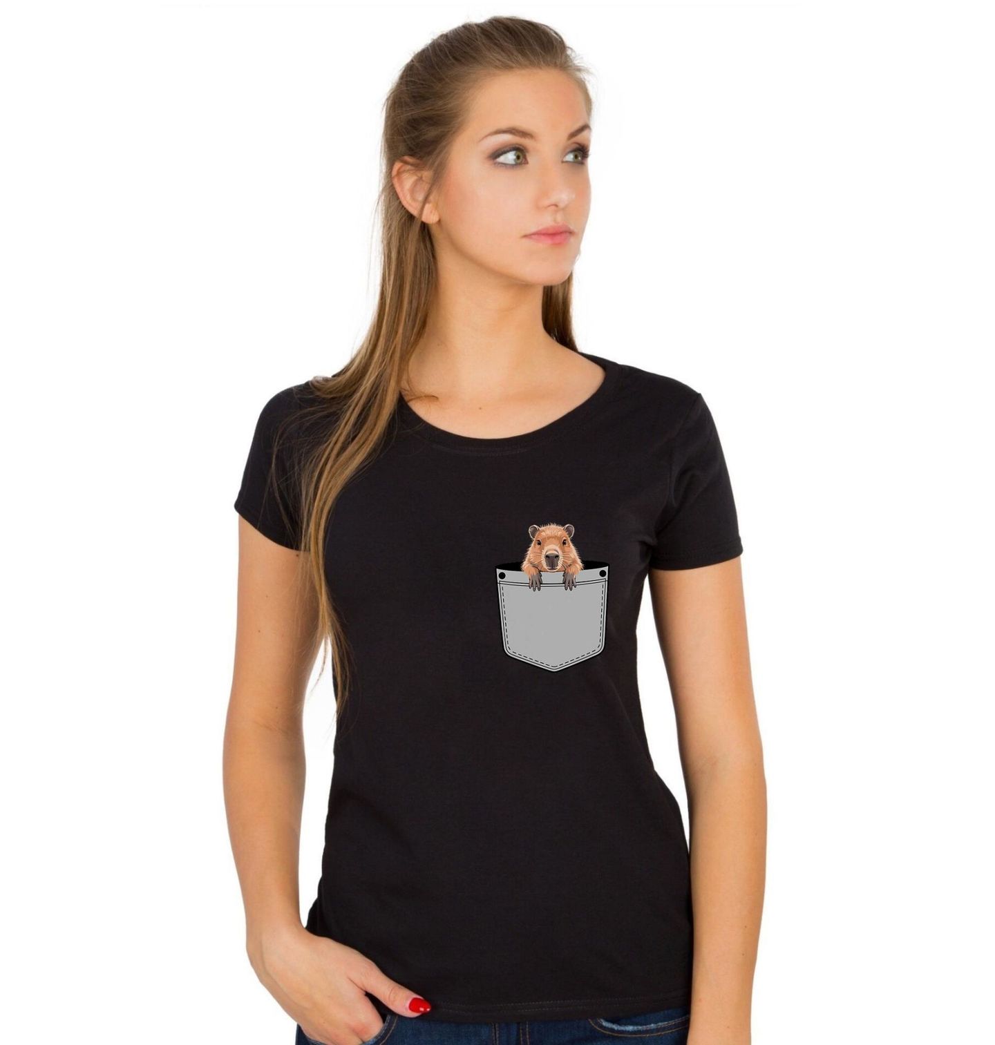 Dámské tričko Kapybara v Kapse. Roztomilý motiv, ve kterém zvědavě kouká z kapsy malá kapybara. Jemná ilustrace zvýrazňuje její klidný výraz a přátelskou povahu. Hlodavec kapybara je oblíbený pro svůj pohodový a vyrovnaný charakter — a přesně tuhle atmosféru přináší i tento design.